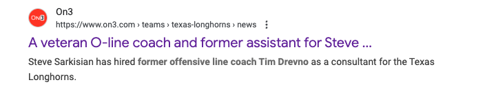 This guy's wikipedia was updated today. https://en.wikipedia.org/wiki/Tim_Drevno "texas adds oline coach" search on google: Drevno does not yet exist on the staff page: https://texaslonghorns.com/sports/football/coaches Not sure if correct, but not paying for the information.