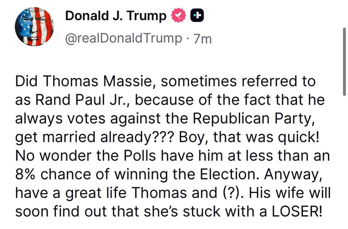 I had to google this but apparently Massie's first wife passed away in June of 2024. And sure Dotard has been married three times and has cheated on all of them, but sure go right ahead and talk shit. Piece of human garbage.