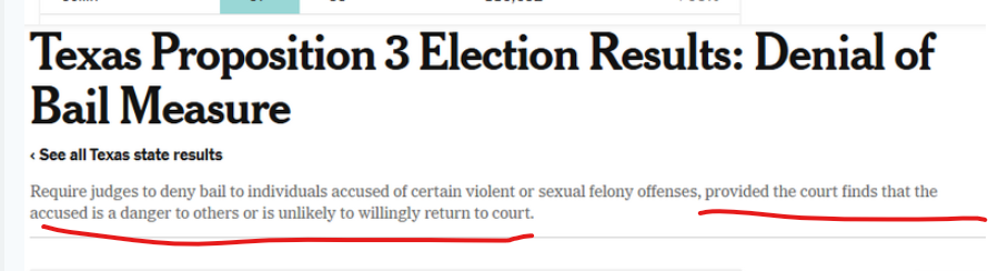I'm always shocked at the voting for TX constitutional amendments. It seems like there are a lot of people who will just vote for all of them. Such as.... How in the blue fuck did this pass? Also... If the court finds that the accused is a danger to others or is a flight risk, don't they already deny bail regardless of the offense?