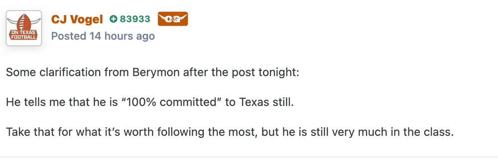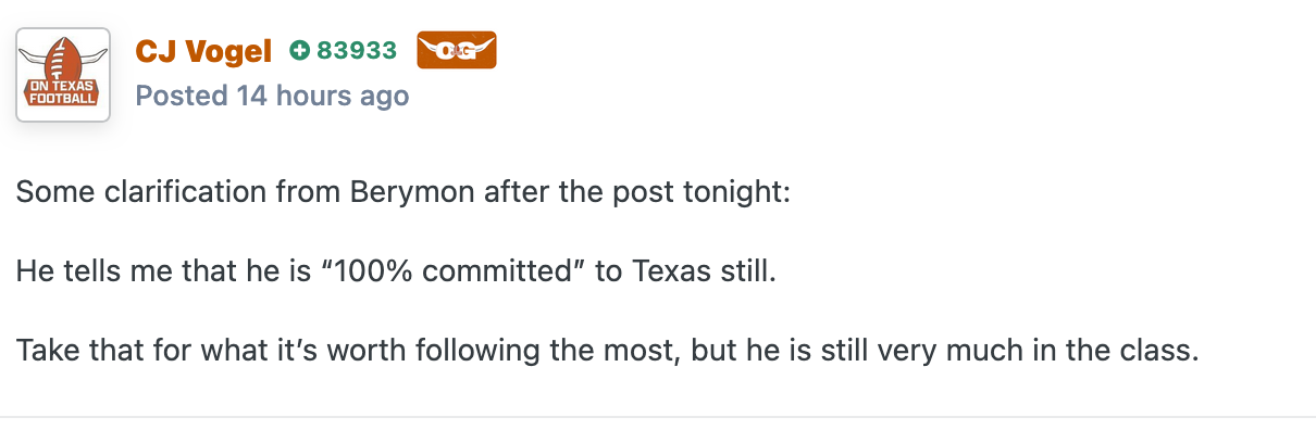 UPDATE 10:40 pm: Berymon tells OTF he is still “100% committed to Texas” and remains in the class. Though now more willing to listen to schools elsewhere it appears. -