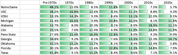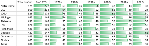 Pro Football Reference compiles all of the players *drafted* from each school into the NFL. I had a little spare time and decided to curate some of the data Notre Dame getting a playoff auto-bid for a top-12 finish would have made more sense in the 1990s or earlier. However, it makes less sense today. Here is the same data, with %-age of overall picks per decade... The pre-1970s %-ages for Texas surprised me, but we've had some lean years in there.... Note that the NFL draft shrunk to 7 rounds in 1994. Fwiw.