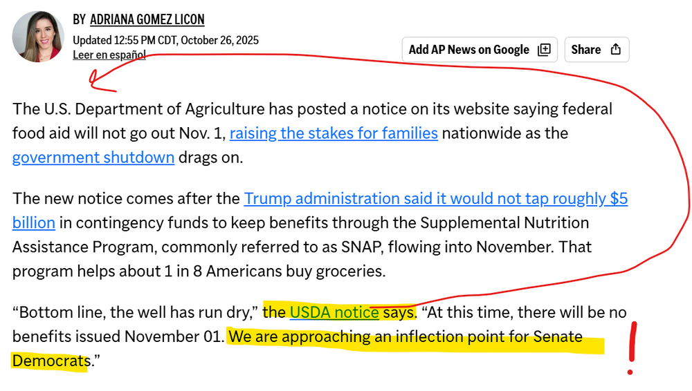 Forgive my humbly submitted addition. I opened up AP to see about the SNAP story. I bet Adriana got straight As in Journalism School! The story here is Trump Administration Denies Food Support to Score Political Points. In an official notice, the USDA blamed Democrats for the Republican Trump administration's decision to withhold food distribution to 1 in 8 Americans. The administration refuses to tap contingency funds set aside to avoid such stoppages. But no. We get the template. Quote service. Don't report what you see. Report what you can quote. Shameful.