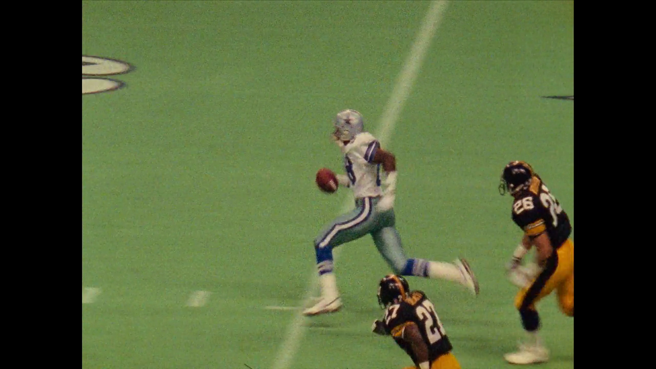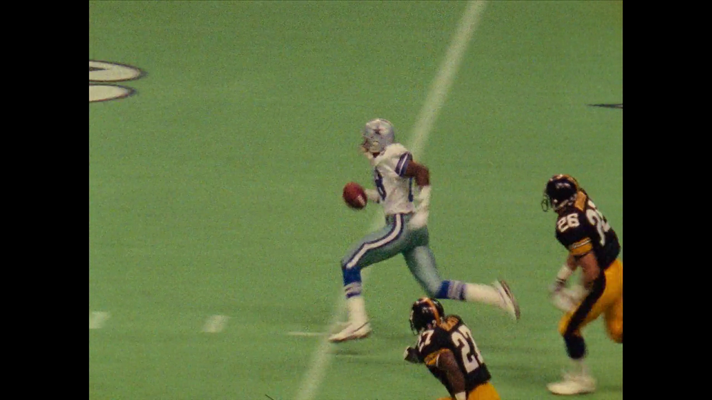 There wasn't a lot of time for Jones in 2 & 3. It starts with the arrival of an incredibly young Troy Aikman and a lot of Michael Irving. They touch on a very difficult first year and then it was a fucking rocket ride with the Niners, the team that won 4 SBs in the 80s, standing in the way. I don't want to spoil anything so I'll just say that they handle a few things that we've all seen before in such a unique way that it's like you're seeing it for the first time. And again, the archive footage has been remastered or something, because the images are eye opening. Almost everything Michael Irvin does is a hoot - the guy is so animated. There's a thing between him and Harper that I'll bet will totally surprise you. Hard to believe we didn't know about this big game incident. They do a good job for setting the stage for some big moments and some big plays, that you likely won't remember what happened until you see them again. Check out Irvin carrying the ball with one hand.