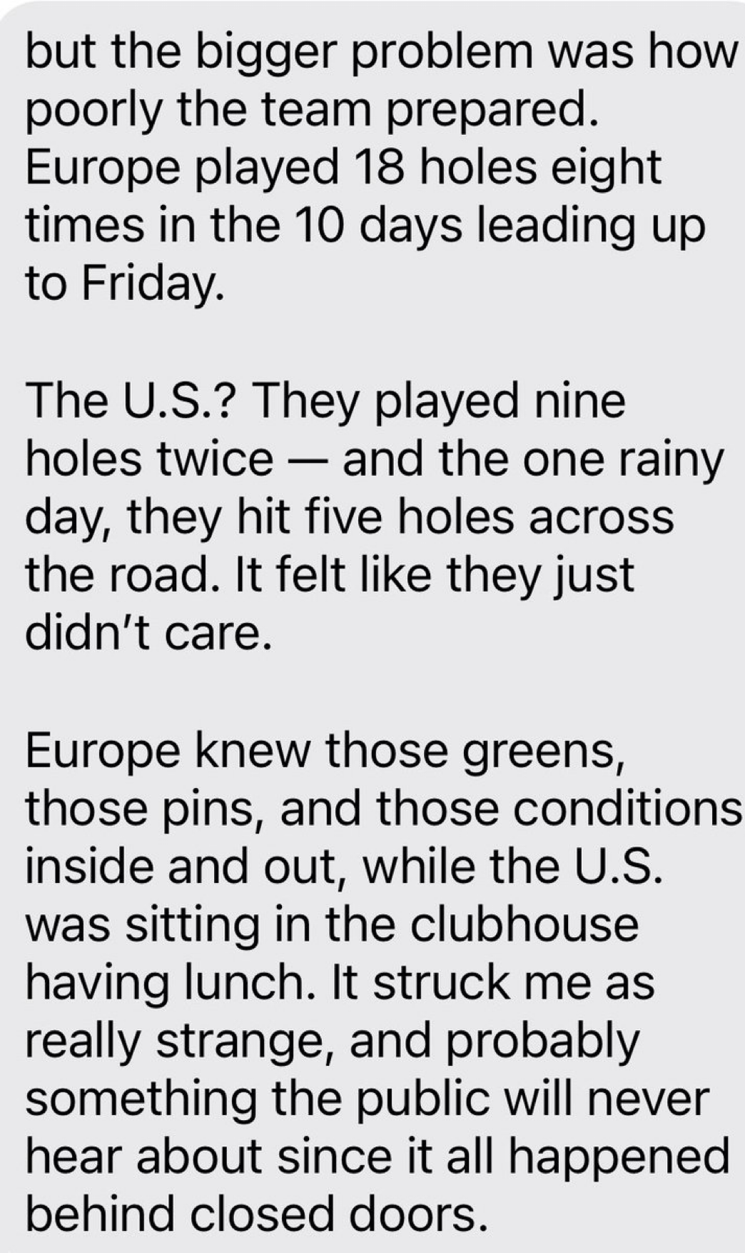 i already knew this but they did a hell of a lot more prep work .... 🚨Breaking from Bethpage 🚨 This is from an insider who was on premise all week at Bethpage. 100% verified. This person wants it known that it wasn’t just pairings and setup. Team USA simply didn’t prepare! Why did Team USA start off seemingly lost? Why couldn’t they read a green for two days? How was Europe so ready? Is it so simple that Team USA barely played Bethpage Black, while Team Europe played it over and over? Imagine how much better they would know the course with 7-8 plays versus 1-2 plays for the Americans. This is hugely embarrassing. We have all been focused on the setup and pairings, rightly. But if this is accurate, Team USA simply didn’t play the course they were playing for the Cup enough! This person gave permission for me to release this info. He/She wants it known how unserious the USA team took this event. There is real anger that the USA Team presents that they are 100% invested, when in reality that’s not true. Or at least they didn’t prepare like it’s a major. If this is true, I’m pissed and all team USA fans should be pissed. Source adds that the round count for the euro team includes Sebonack and Shinny, two bonding rounds.