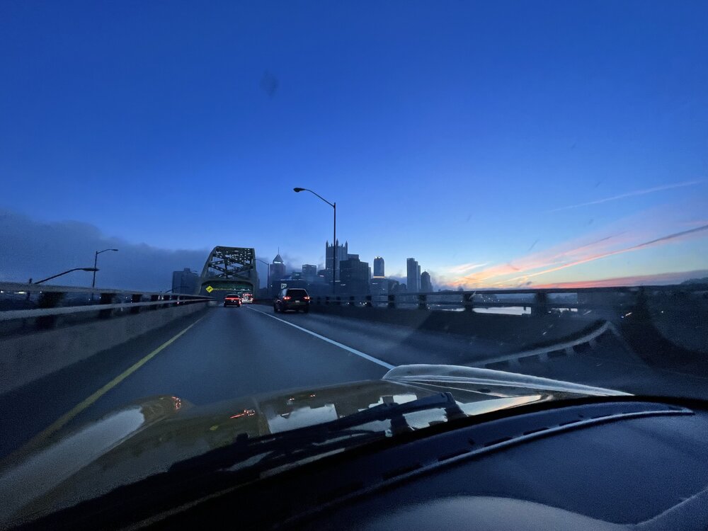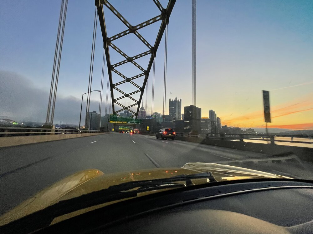 Sunrise over Pittsburgh. Made an early run to drop off a buddy at the airport. Top down, of course, 34 degrees.