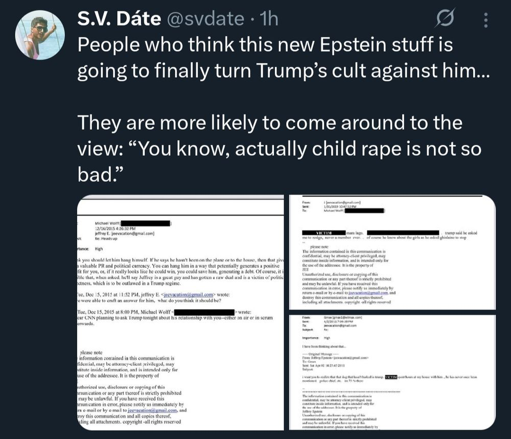 All he has to do is say “fake news” and half the country nods along. They also believe inflation is down and that the economy is the best economy in the history of evar. Another round of trans panic or Mexican CARAVANS can always be deployed if necessary. Literally nothing changes these peoples’ minds and it all feels pointless.