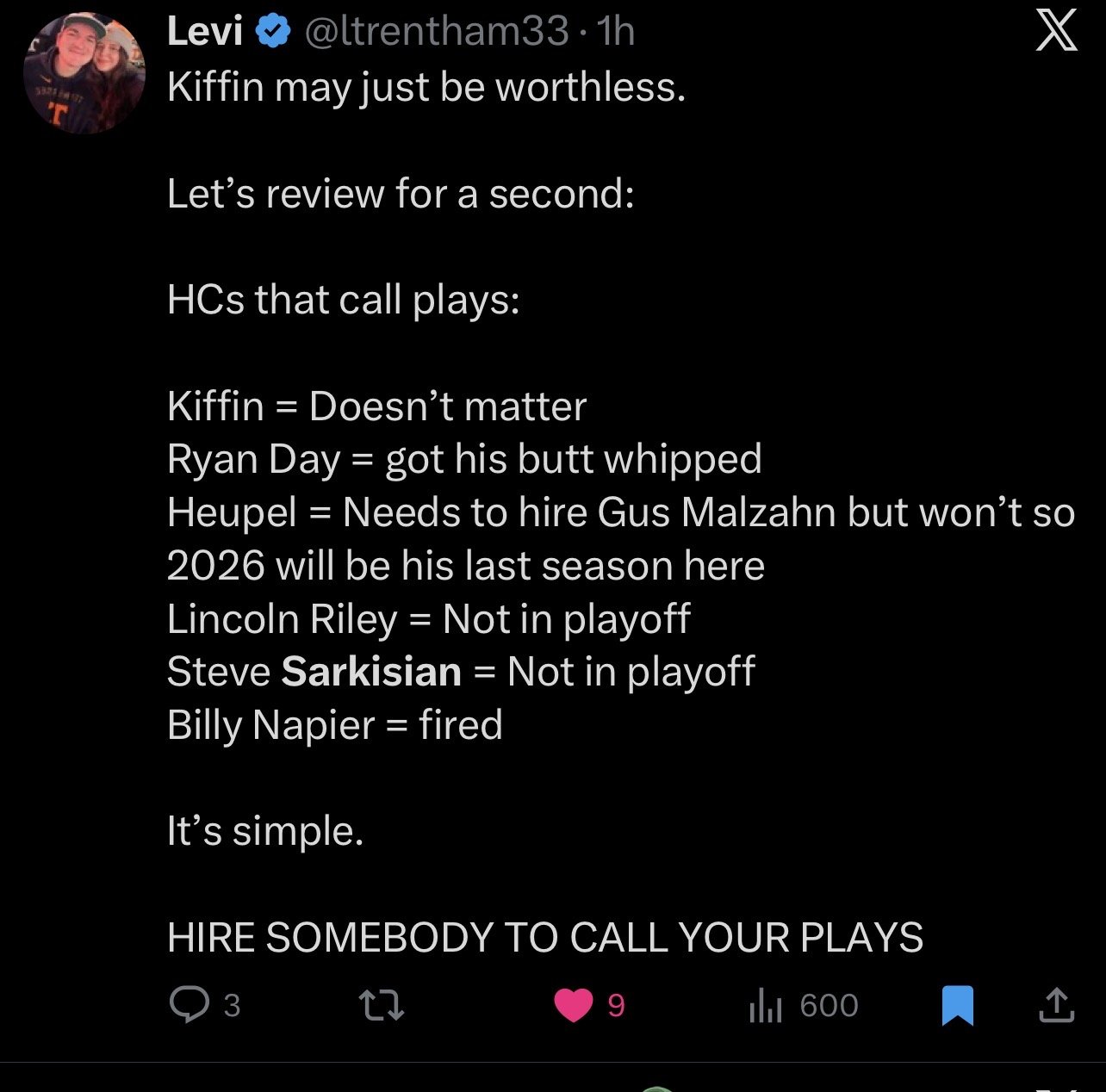 No doubt. They are Grown ups in a process run by adults that know how to coach. And emphasize that hard work and a process a regular practices yield results. One of the greatest strengths of a HC is being able to manage his hand picked staff. Cig also has an innate ability to spot talent. Something he did well under Saban. Something he’s done in his short tenure so far as a HC both at JMU and at Indiana. What he’s doing is sustainable. It’s not exactly what TCU did but he’s building strength year over year in a division in flux. Hats off to him 🤠 🤘🏼 in one year he has beaten two HC’s that Sark still hasn’t been able to beat. With all the money and resources in the world. Truth. Cig isn’t trying to scheme the defense or the offense. He manages the entire team and entire staff. Thats a HC to me. I am not sure if the below list is accurate as far as HCs trying to be a coordinator also but it stands to reason that a HC should not be both a HC and a coordinator,- Trump’s America