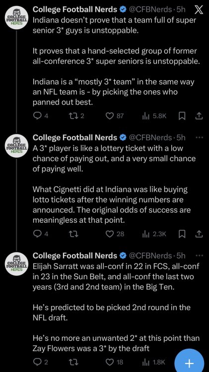 it’s a purely speculative market right now. The knee jerk reaction to NIL was spend it on recruits, but there’s too many uncertainties with that to be a sustainable model. At some point the value will return in paying a kid to develop in your program. This whole “Indiana’s old guys are beating the shit out of heralded recruits” won’t last because others will follow a similar philosophy and the market will saturate. Fascinating to watch the entire ecosystem oscillate so violently in the first few years of adoption. Truly shows the innovators vs the luddites who struggle to adjust.- Things Not Going Well in Venezuela, 2.0