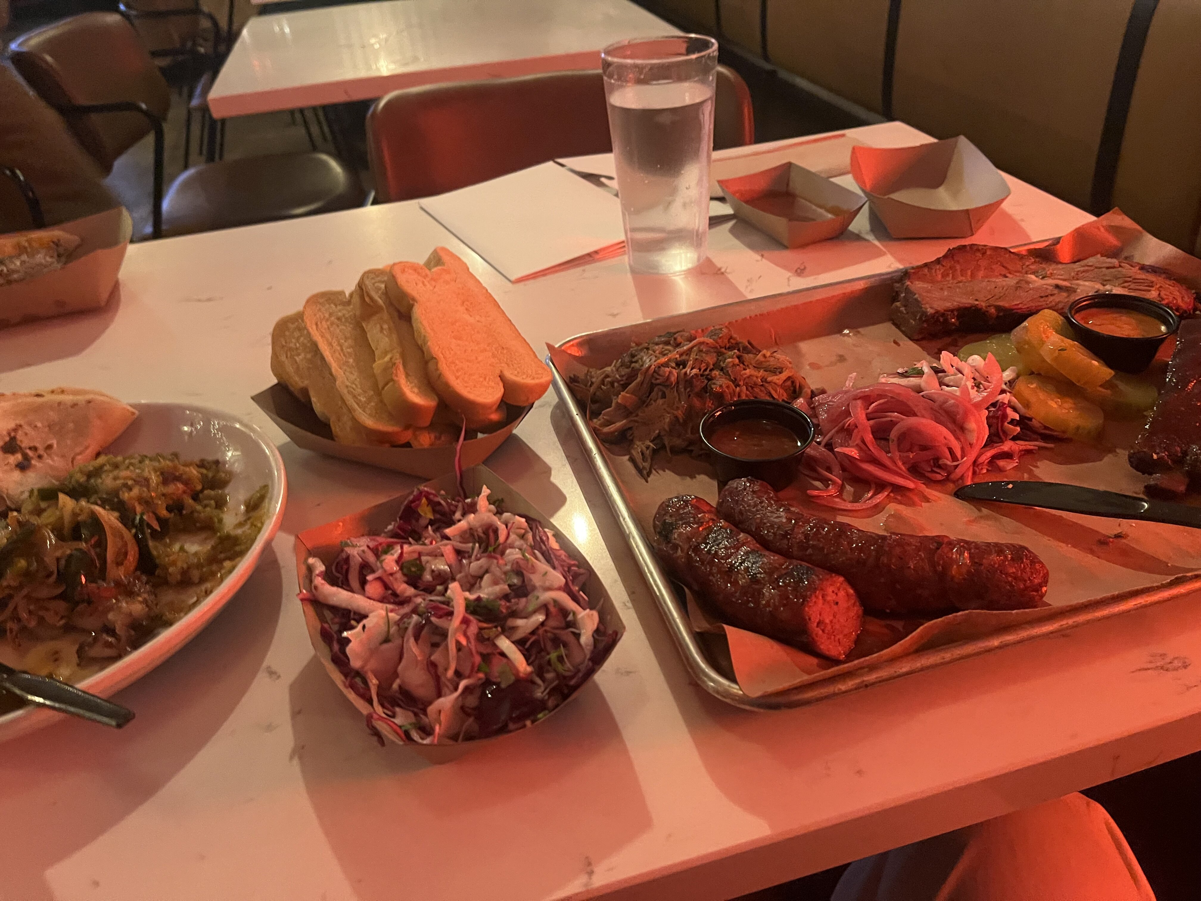 churchrow. mollejas on the left, very good. tortilla 10/10. brisket 8/10, sausage 9.5/10, pulled pork 8/10, pork rib 9/10. cole slaw did its job admirably.