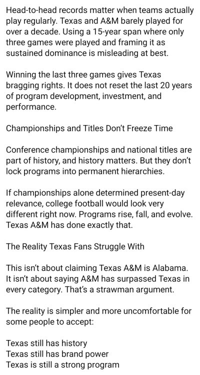 And also, look at the penalties our lack of discipline on the OL has caused - holding, offsides, whatever. Isn't that Flood's group? Shit his group alone cost us at least 50 yards a game... Factor being just bad - add another 30 yards minimum for Arch running for his life. That's a minimum of 80 yards a game due to Flood sucking on recruiting or developing or taking half a season to get a little better. This is the best Texas has? Glad we aren't GA or tOSU or similar. But hey, we're going to retain this shit ...