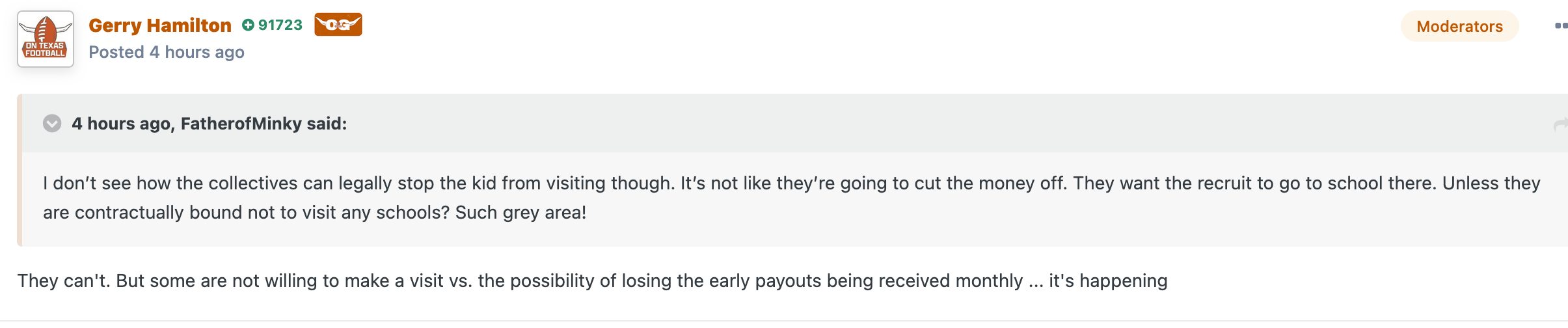 Recruiting: Coaches on the road; 5-star visit update (Thurs. 5:30am CT) By Gerry Hamilton Recruiting: Coaches on the road; 5-star visit update Members of the Texas staff will be on the road starting today. Stops include LSU 4-star+ OT commit Brysten Martinez, 4-star defensive line commit Corey Wells, 4-star+ defensive line commit Vodney Cleveland various stops in the Lone Star State and likely a coach in the Sunshine State. OTF dives into the latest on the recruiting trail as the coaches begin their stops for the week. November 22-23 visitor list ... 5-star Richard Anderson, DL, New Orleans, La./Edna Karr - *LSU commit (maybe/likely) There were reports of Anderson possibly visiting for the Texas A&M game. That is not what OTF was told Wednesday night. It's the Arkansas game weekend that Texas is targeting, and had discussions about with Anderson and his circle yesterday. There is some pressure from those around LSU NIL to not make any visits. Texas coaches are expected by the school Friday. 4-star+ Brysten Martinez, OT, Gonzales, La./East Ascension - *LSU commit Texas had a very successful unofficial visit last weekend, and now are expected to receive and OV. Who and when LSU makes their hire looms large here. 4-star+ Dre Quinn, EDGE, Buford, Ga./High - Ohio State or Texas decision expected by the 6-4, 230-pounder. The Buckeyes may have the slight momentum edge currently. 3-star++ Toray Davis, DB, Boulder, Colo./Fairview - Washington very much in it after a recent OV. November 22-23 will be a first visit to Texas. Defensive line recruiting ... Four junior college prospects are being evaluated. Two at defensive tackle, and two at edge. More on that in the coming days. Texas continues to recruit 4-star+ DL and Florida pledge Kendall Guervil (Fort Myers, Fla./High). This is the first week that Guervil has been a little more shaky about coming in for a visit. Florida collective applying a lot of pressure right now to stick. Texas would accept a flip commitment from 4-star EDGE and Baylor pledge Jamarion Carlton (Temple, Texas/High). Texas is also staying in contact with 5-star LSU EDGE commit Trenton Henderson (Pensacola, Fla./Pine Forest). -
