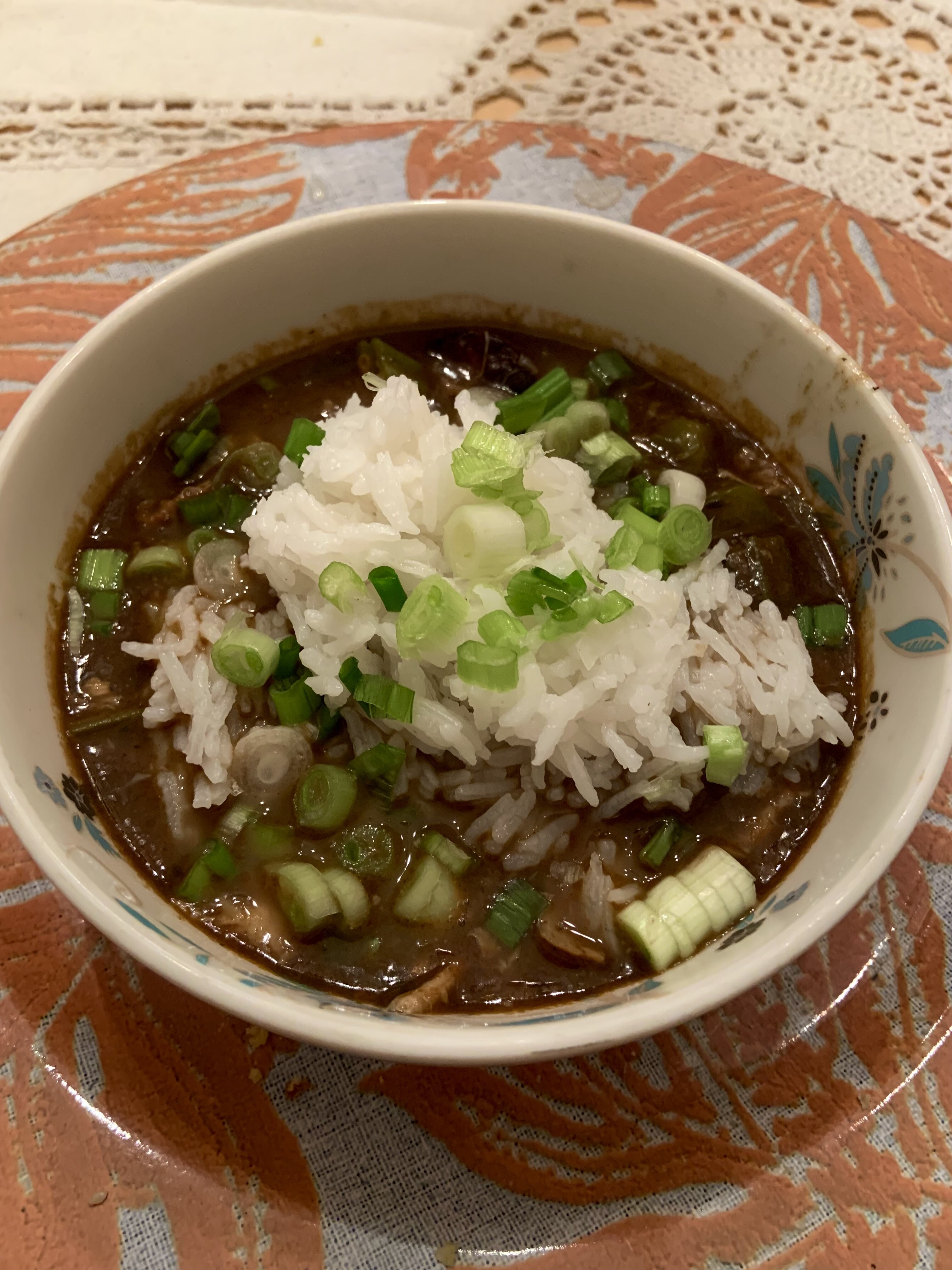 Chicken and sausage gumbo. Picked a grocery rotisserie bird clean for the meat and used the carcass for the stock, oven roux. -
