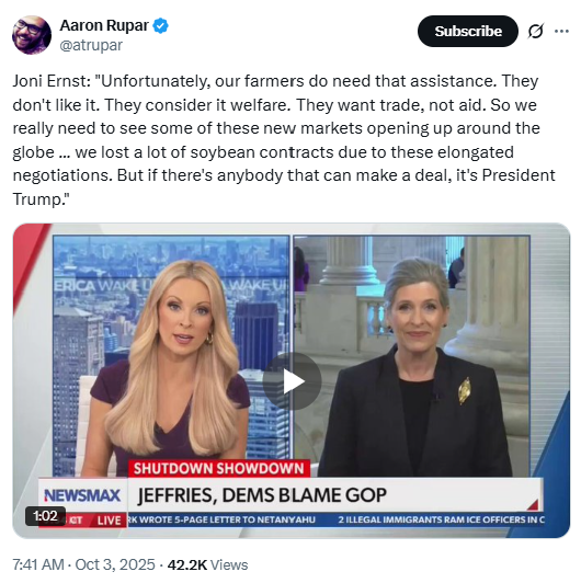 Trump destroys the soybean farmers. Joni's solution? Our farmers were ruined by Trump; the only way to fix it is MORE Trump!