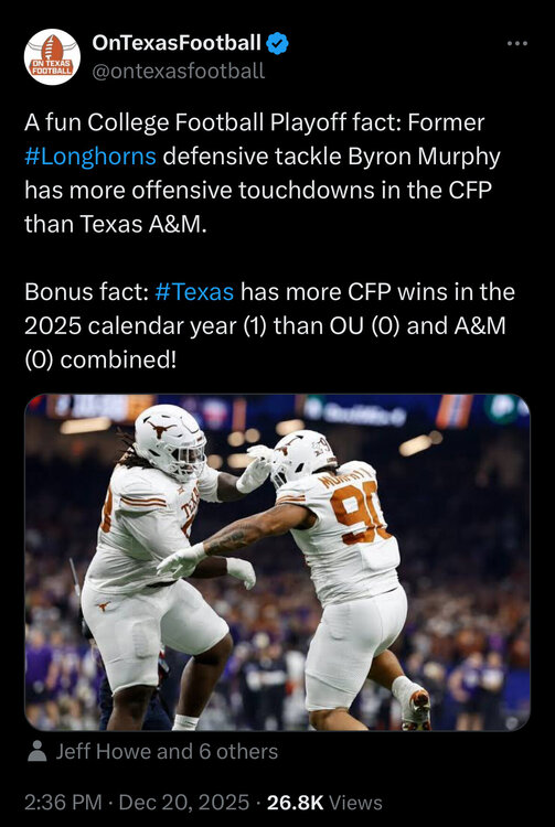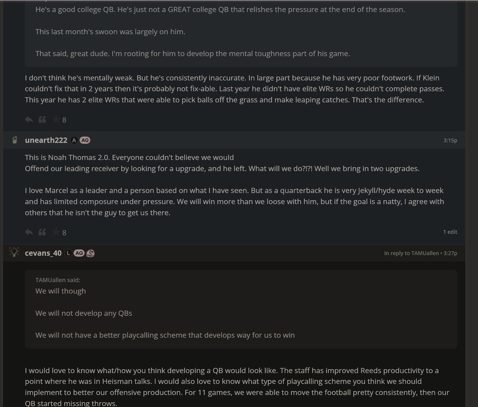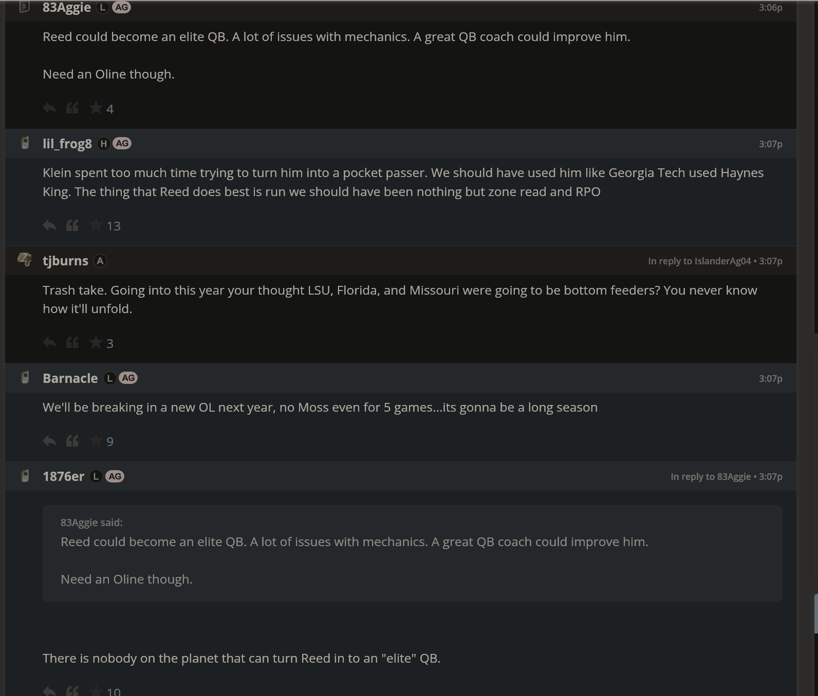 I really appreciate the posts here. Got to say you give @RomaVictaa bone and it's wonderful. Many others too. I'm on record pre-season saying Reed was a terrible QB. I am also on record calling for Arch to be benched at times. Arch seemed to figure out feet don't catch balls. aggie hires a 2 year HC from Duke and expects greatness? Well, that's Gary Owens funny. Of course he has no tree or ability to get top guys. I still say Flood can be upgraded. Sark's recent hires seem top notch. For two years in a row we've kept aggy out of the SEC championship. Wisner is balls out on them. aggie is going to have a really bad next year. Our schedule is no joke either. Anyway, thanks to all of you that give us the aggie tears of failure. -