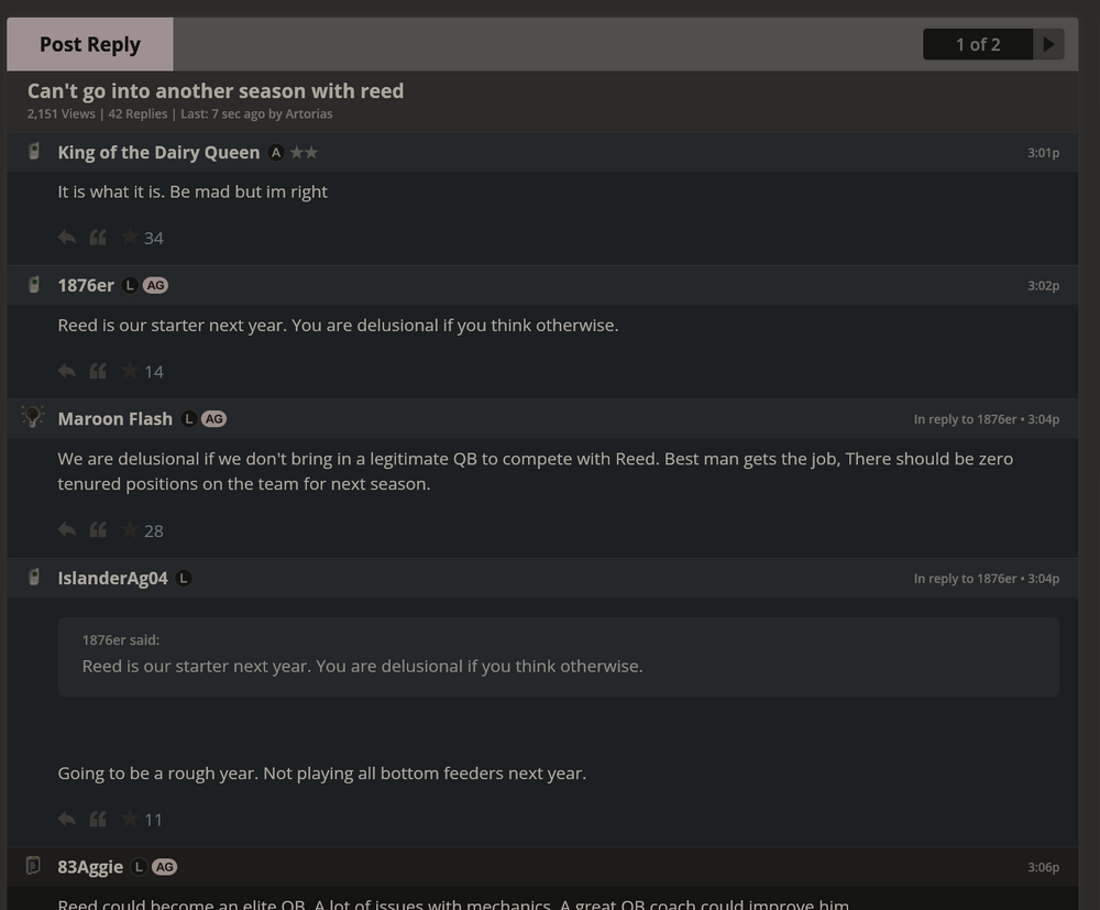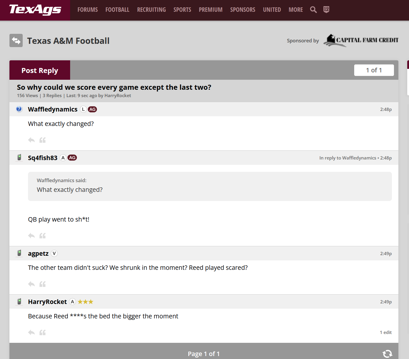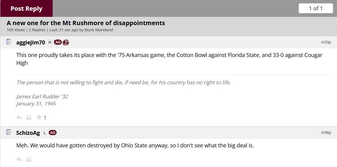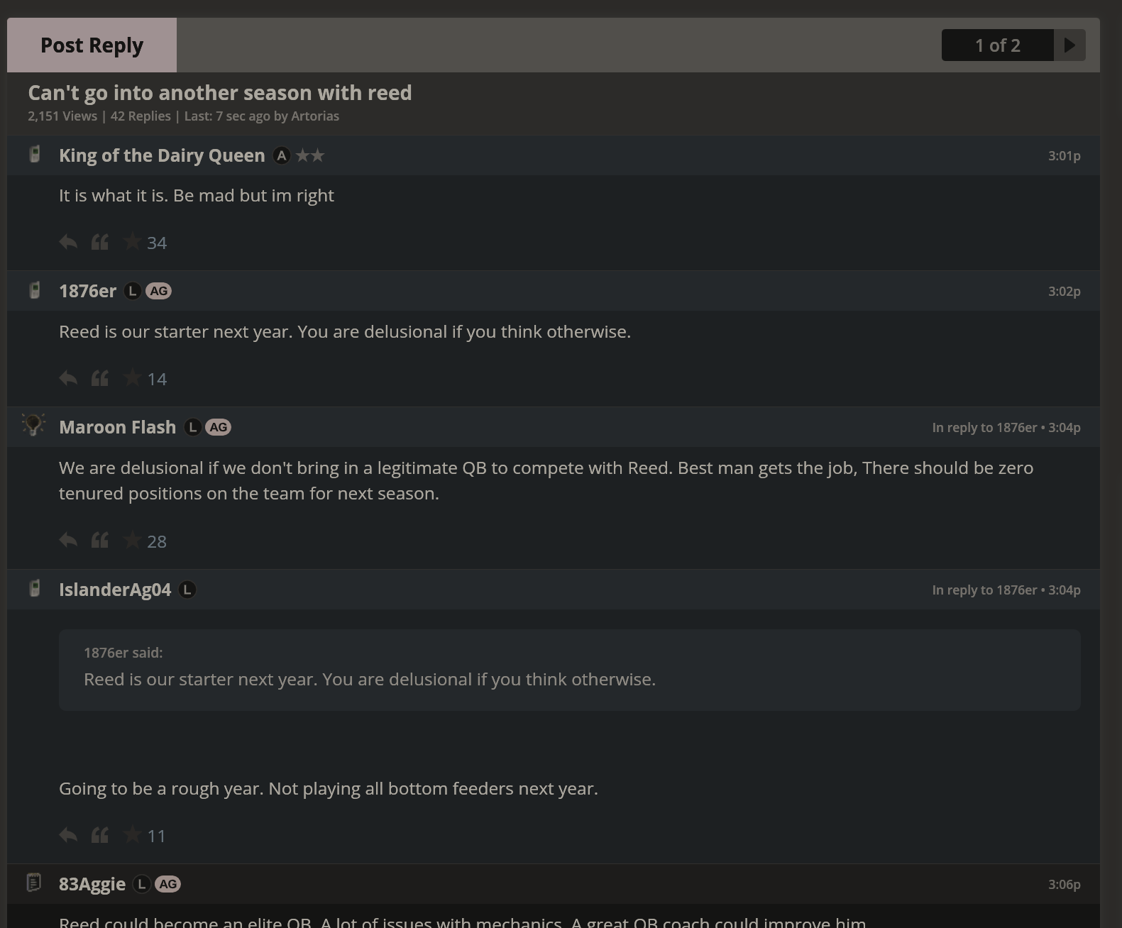 I really appreciate the posts here. Got to say you give @RomaVictaa bone and it's wonderful. Many others too. I'm on record pre-season saying Reed was a terrible QB. I am also on record calling for Arch to be benched at times. Arch seemed to figure out feet don't catch balls. aggie hires a 2 year HC from Duke and expects greatness? Well, that's Gary Owens funny. Of course he has no tree or ability to get top guys. I still say Flood can be upgraded. Sark's recent hires seem top notch. For two years in a row we've kept aggy out of the SEC championship. Wisner is balls out on them. aggie is going to have a really bad next year. Our schedule is no joke either. Anyway, thanks to all of you that give us the aggie tears of failure. -