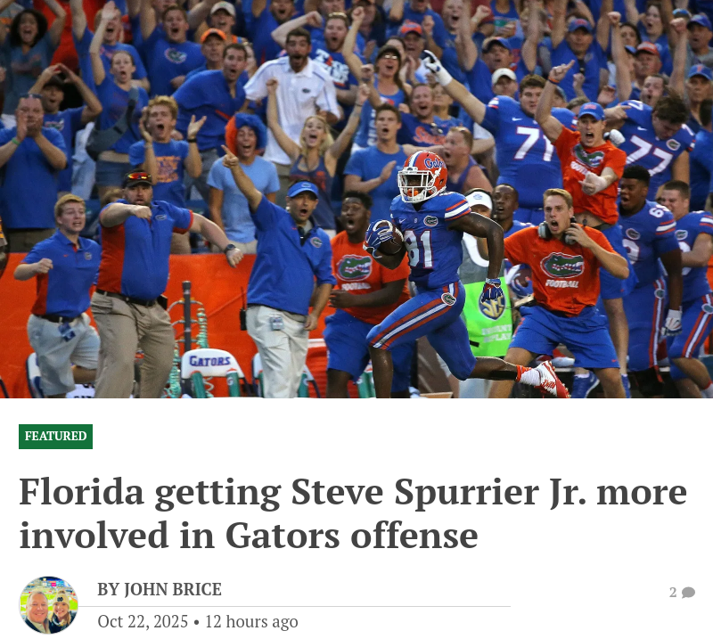 Yah left the following out... "Ryan O'Hara will call plays from the booth and Steve Spurrier Jr. is going to have a more active role on the field with the quarterbacks" . Spurrier Jr.'s role is an elevated one from his standing as an offensive analyst with the team. Elevating the role of Spurrier Jr. Gonzales explained, was done so with Lagway in mind. "First and foremost, Coach Spurrier has been with us all season long, working with quarterbacks and with Coach O'Hara," said Gonzales, who also praised Spurrier Jr.'s offensive knowledge from being around his father, the legendary Steve Spurrier. "This allows us to move Coach O'Hara upstairs and have somebody who's been communicating with DJ all season long." https://footballscoop.com/2025/10/22/florida-getting-steve-spurrier-jr-more-involved-in-gators-offense -