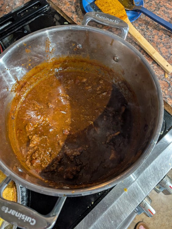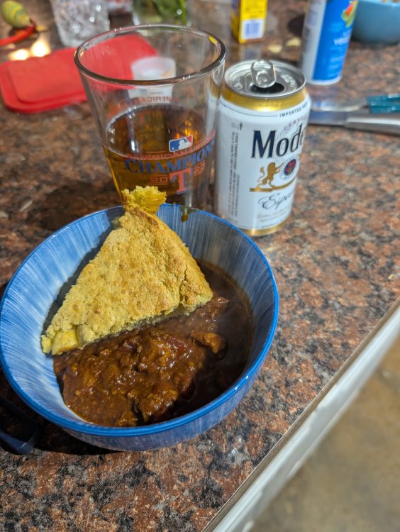 10. Not sure if the chilli purest will agree. But this time of year, I try to use up all the meat I have frozen. It's a a combination of left over smoked meats and random meat I find on sale or in the about to expire discount meat. This chilli was made with ground turkey, left over smoked tritip and and some pork stew meat. Started with one of those pre packaged 2 alarm chili then added random extra chilli, paprika cummin ext. Boiled with beer and Modelo. Simmered for about 4 hours to reduce. Plus some Mexican cornbread