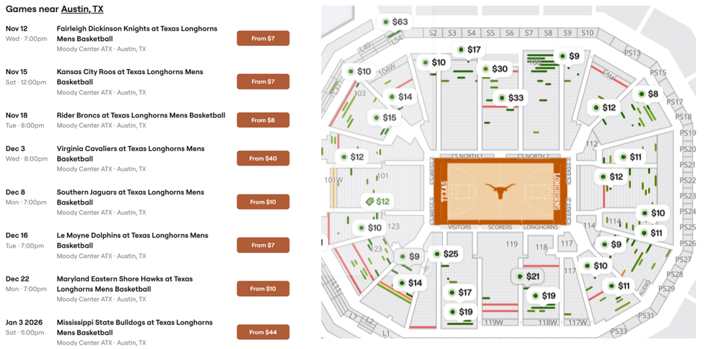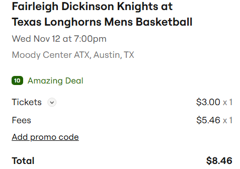 The one positive aspect of our dogshit non-conference scheduling approach is that it absolutely destroys the resell market. These prices include the fees on seatgeek, and the seat map is for tonights game. Comical how cheap it is to get into Moody for these games. Obviously its the STH/brokers that feel the pain, as the university could give a fuck once the tickets are sold originally.