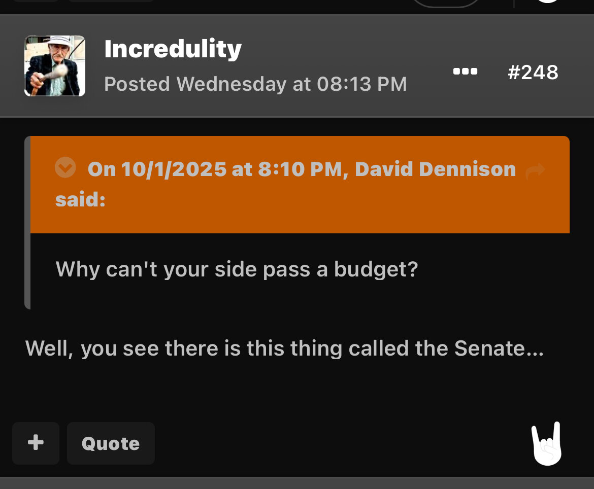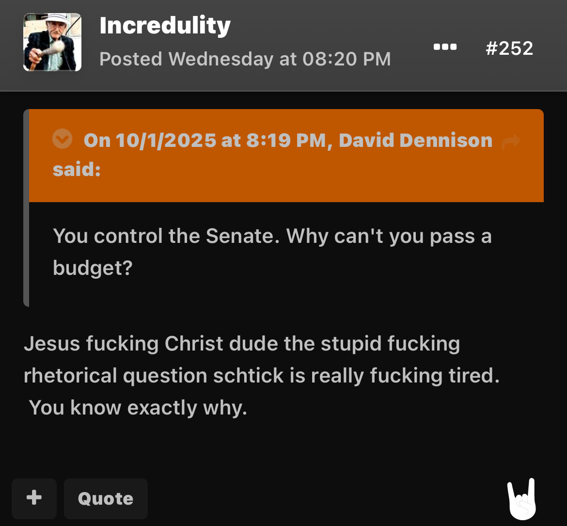 Well its probably because your previous posts seemed to imply you didn’t understand Senate rules as well as a 3 toed Neaderthal. I am glad that you are now in agreement that the shutdown is 100% in GOP control! P.S. Nothing in this post is a threat in any way!! -