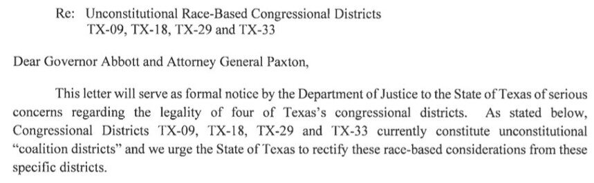 SIAP but here is the letter that Abbott, Paxton and now the DOJ says has nothing to do with how the Texas govt redrew that maps even though that they followed it. Pure coincidence. https://lrl.texas.gov/scanned/archive/2025/57372.pdf Non-lawyer but if redrawing districts, due to race, is considered unconstitutional I would assume existing districts based on race are also unconstitutional. Wouldn't the proper method be to attack the current map in court to get a judge to toss out the current maps and then create new non-racially designed maps? Obviously that could be a longer process than just breaking the law. Beg for forgiveness, not ask for permission. What's funny about the 18th district (Houston) is that I don't disagree that it long had a consistent theme that the GOP packed minorities in that district to create more GOP seats. Past Republicans weren't so brazen to go as far as disenfranchising all/most Democrat voters in Houston. Now they want to crack the districts to overwhelm central city voters with suburb or rural votes. -