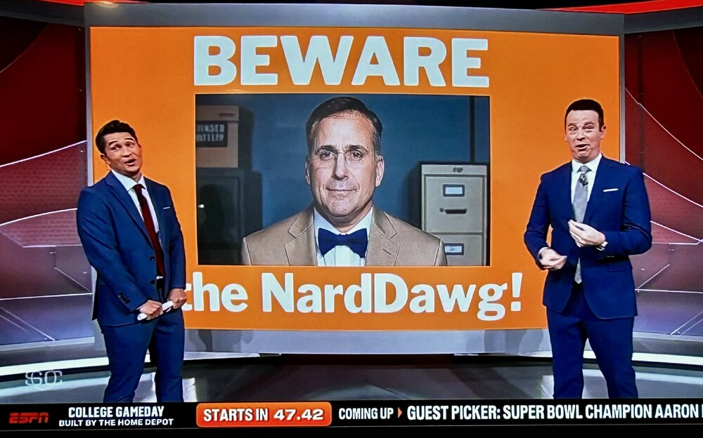 now they are producing ai slop and throwing it up on the screen. the guy on the right says he typed in “pat narduzzi as andy bernard.” and that’s what’s on sportscenter this saturday morning. take it back off the air.