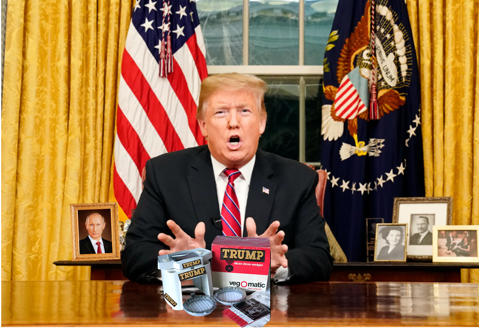 I've personally invented this wonderful kitchen tool. People are saying it's the best slicing and dicing tool ever. I don't know, but that sounds pretty good. They wanted me to sell this for $300, but I told them no and fired them. We can ship these babies, free shipping by the way, nobody does that, but what can I say. I love this country. So, we can get one of these, I don't know, maybe buy two, anyway, the Trump Veg-O-Matic will arrive at your house in time for Christmas for $199.99! Any of you kids out there still believe in Santa? Thank you for your attention to this matter. [stage manager: And we're out!]