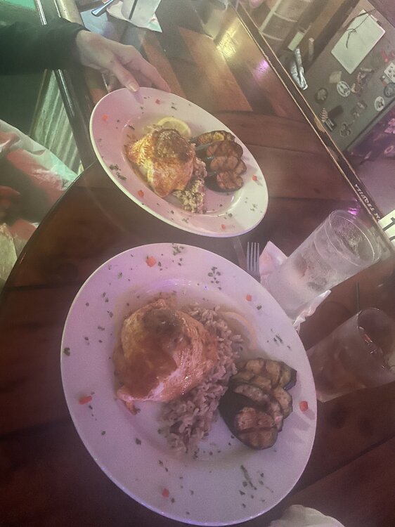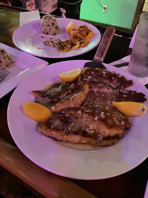Well had my 20 days in Port A and back in Austin. With two redfish limits pulled out of the Fish pass Jetty, and getting Redfish catch cooked at La Playa, and the Trout and Flounder cooked at Kody's. Outside of watching the disaster of the Florida game, the trip was as usual, relaxing and awesome. But here are a couple pics from the trip Sunrise from beach in front of IB MaGee looking at jetty 20 inch trout converted to Garlic Fish at Kody's Edwin the owner of Kody's asked my how big my flounder was. I said pretty big (21 inches) and he said he would make us something special if we brought it back in the evening. Pic is crap as my camera was still damp and fogged. But he basically wrapped a crab cake, with flounder filets, tossed it int eh broiler and then hit it with a white wine sauce. Charged us 14 each for the fish cook, and for a single crab cake. Having my fish cooked by Kody's and La Playa is one of my real pleasures in Port A! Anyhow see ya soon Port A! Tight lines, good meals, and a good buzz!