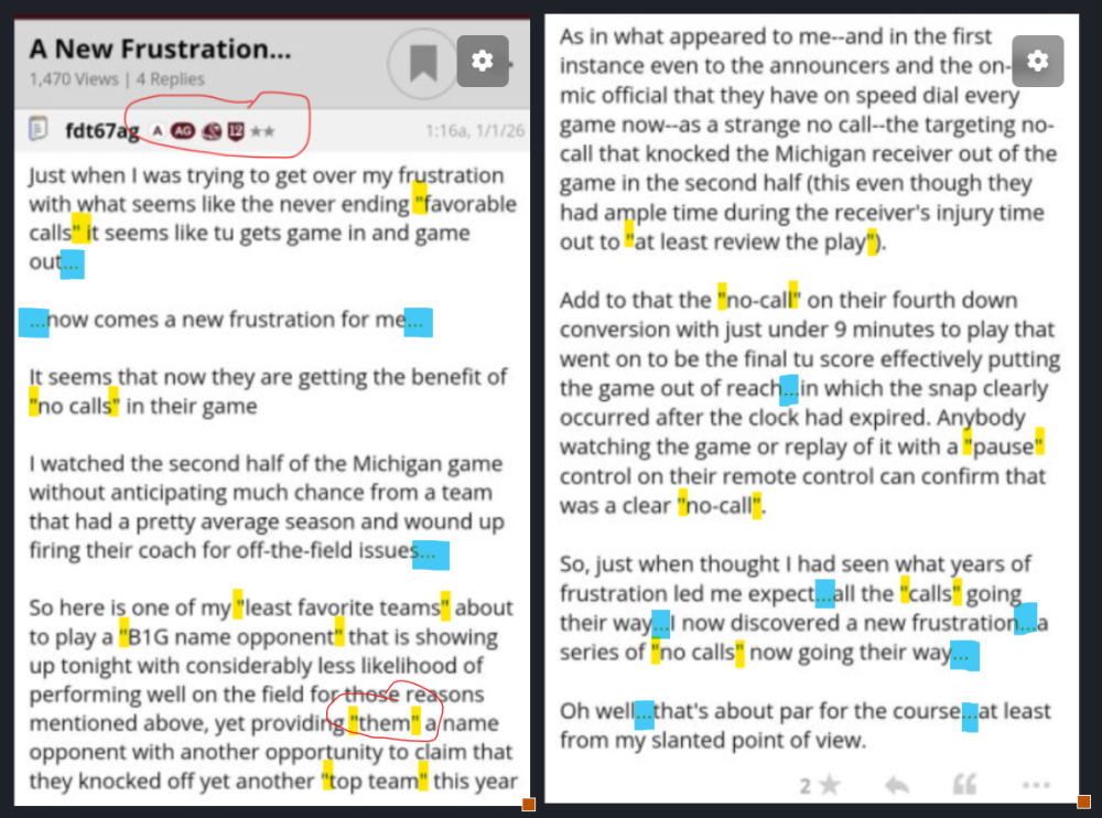 Thanks, @texifornia . This is quite an example of "fine writing." Has somebody changed the grammar rules for quote marks (yellow)? He may use them correctly once to show scorn for "top team" although the Wolverines are ranked in the top 20. The rest? Putting quotes on a pronoun is particularly bold. Then I noticed the use of ellipses (blue). I bet he's revered as a smart guy in College Station, but is insufferable for anyone else to listen to for even a moment...