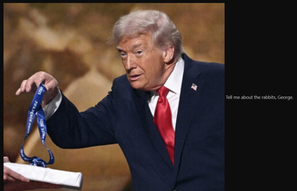 I think it's a little of both, and I think Trump can only punch down. Four very recent examples: Mamdani's appearance at the White House. He confidently went into Trump's space and didn't cower, didn't grovel, and Trump can't punch back in those circumstances. Trump clearly still thinks about NYC, and damned if he wasn't in love with its new mayor. He was even asked about his comments about Trump being a fascist, and Trump defended him/changed the subject. South Park. Trump has constantly gone after broadcast networks to get late-night hosts canceled, because he had leverage over those networks and their licenses. Matt and Trey give no fucks and literally got paid "FUCK YOU" money and are now basically untouchable and are just fucking merciless, mocking his dick size, even doing some live-action bits making fun of him and his dick size, mocking how much of a piece of shit he is, how incompetent he is, how wrapped up in TikTok or twitter his underlings are, etc. Just showing no mercy. The White House issued a tepid response and then backed off, probably out of fear of more of MAGA seeing it. Governor Newsom. He has flipped Trump's attacks and his fake awards around and is just pounding away using Trump's wording and style, constantly mocking Trump's actions. You'd think Trump would be sending in the National Guard to more CA cities to try and put Newsom in his place, but given the previous deployment was mocked, plus he's been embarrassed to see Newsom use his own words and attitude against him, he's mostly leaving Newscum alone. Mark Kelly. Trump and Hegseth threatened him, claimed he was seditious and Kelly challenged them head on. As TwiceHorn said, Hegseth probably talked to a real lawyer, plus he was being clowned for not realizing the photo was in a mirror. Trump probably recognized at some point that Kelly was looking for a fight all the while Kelly's stature was being elevated. Oh, and Trump probably didn't realize what had happened with the second strike stuff until after he went after Kelly. You are 100% right, he doesn't feel like a coward when he sees clear weakness. And he doesn't understand Ukraine because Trump has never been the underdog - he was born on third base and thinks he hit a triple. In his world, the one with the most resources/money should automatically win.