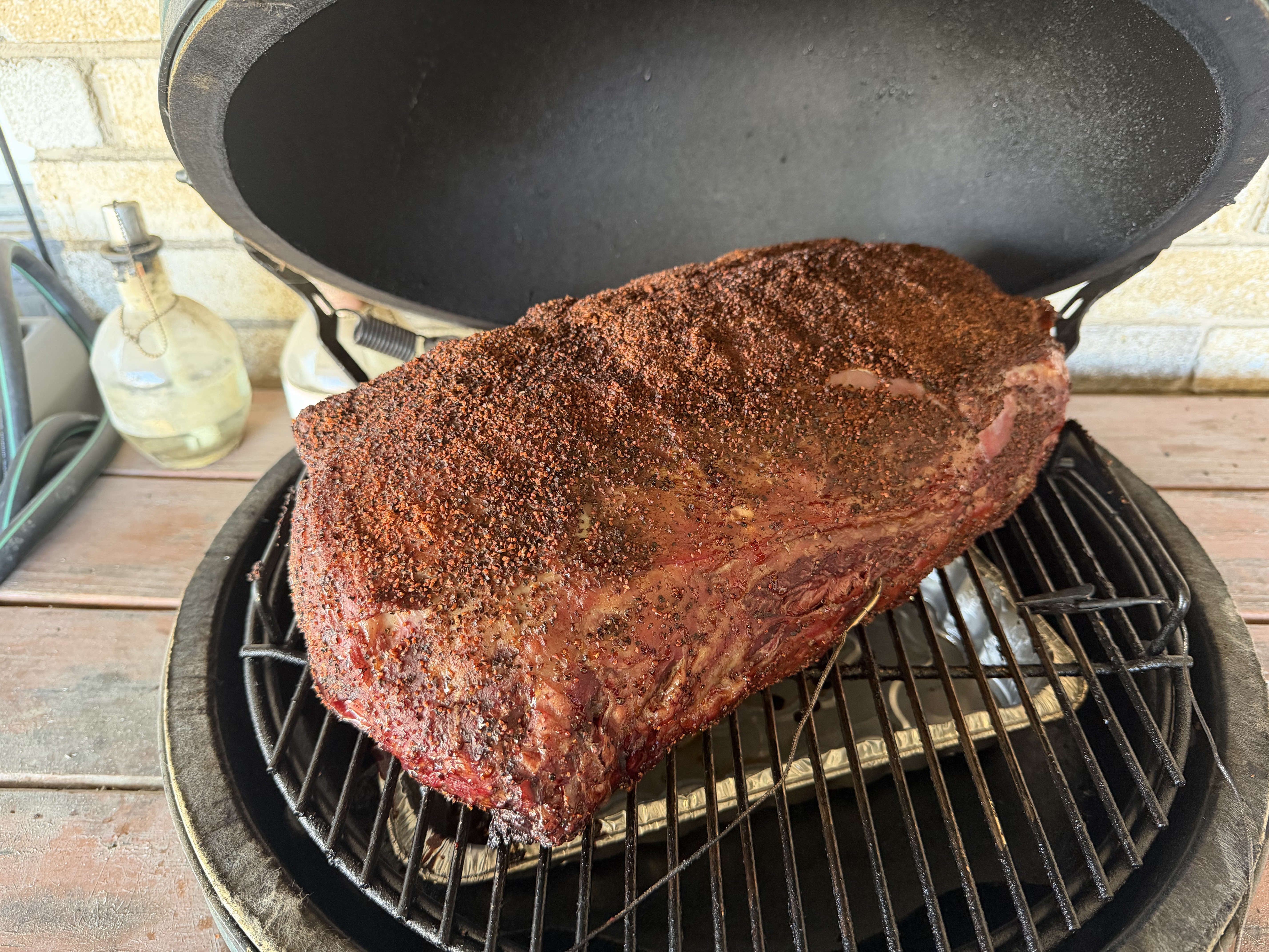 3 hrs in. Cooking much faster than I expected. Gonna have to wrap and cooler it til 5 Probe is showing 116.