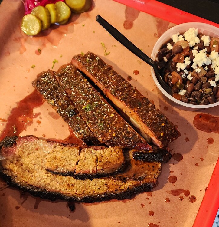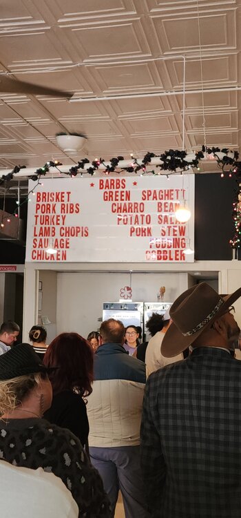 Stopped at Barbs-B-Q on the way back from Port A today. Got there around 1:30 and the line was manageable. While we were in line they started running out of stuff - sausage, then lamb chops, cobbler, then turkey. After all the barbecue from Butter's in Friday, we didn't need much. Half pound moist brisket, two spare ribs (Chuck tossed on a couple smaller ones), charro beans, and, not pictured, a side of pork stew and Mexican hot chocolate pudding topped with sliced strawberries. Everything was spot on. Went we finished about 2:15, the sign red "chopped beef only".