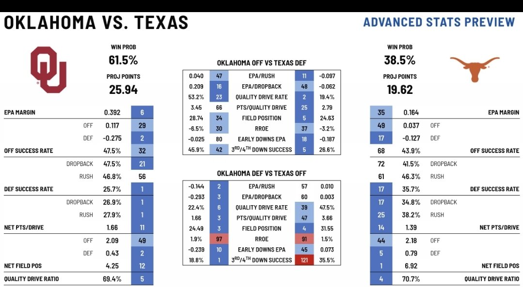 Fuck it, we're going to win. This game has a 2015 vibe to it where OU is undefeated in the top 10 and we're unranked. We'll win. Hard to believe according to Vegas that we're still a -3.5 point favorite with a 61% chance to win.
