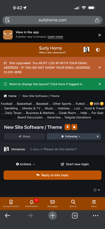 I normally hate change to UI, but this one looks good. Get post #’s back and this will be great.Football ... Basketball ... Baseball ... Other Sports ... Futbol ... 🤫995🤫 ... Gambling ... Movies & TV ... Music ... Hobbies ... Lulz ... Food & Travel ... Daily Texan ... Business & Markets ... Cloak Room ... Help ... For Sale ... Board Discussion ... Advertise... Tailgate DonationsBack to topAccount