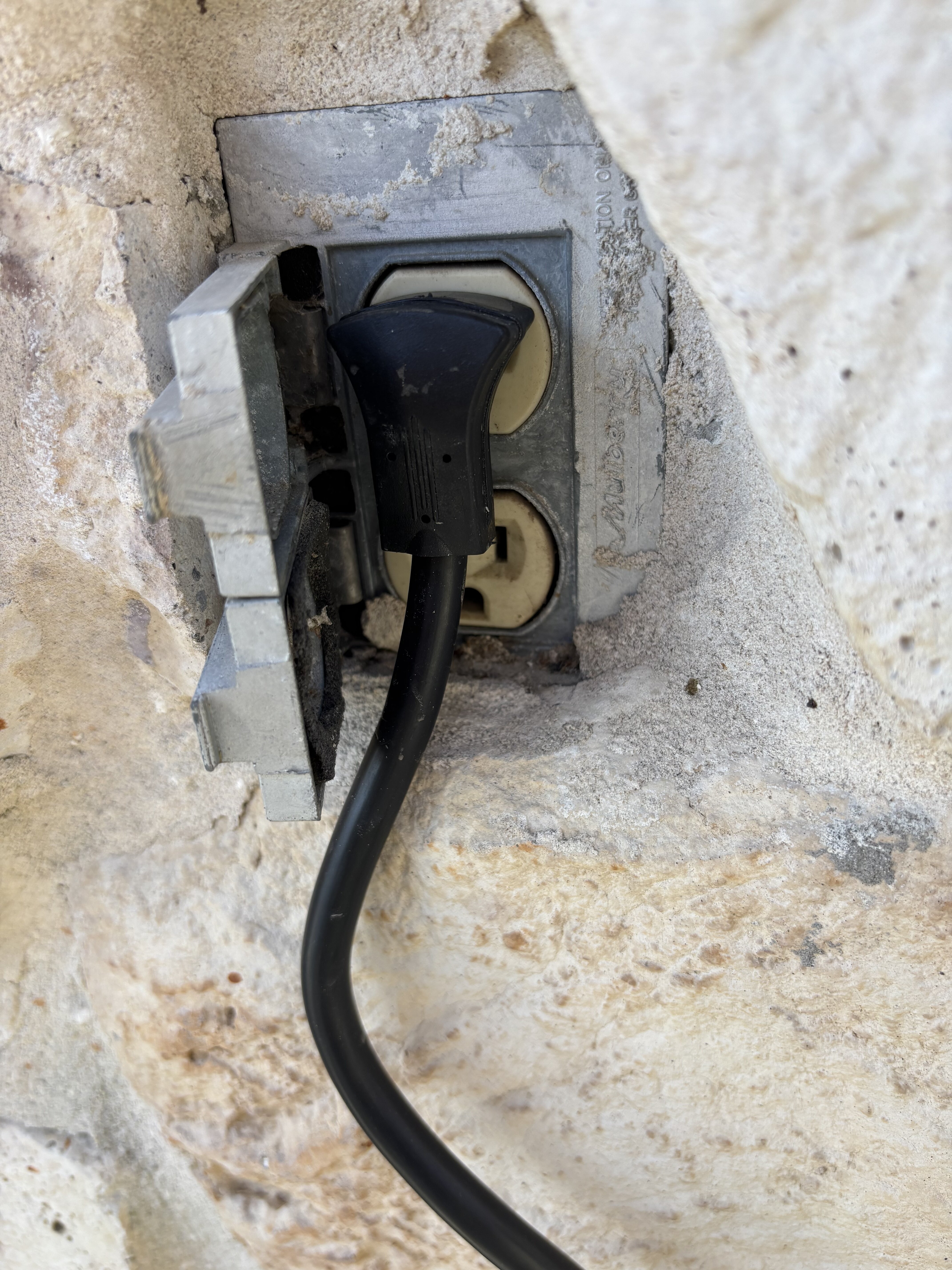 The same Aggie that engineered Christmas light circuits engineered this damn plug for my outdoor lights timer. I need the second outlet for heat tape for a hose bib, but no—damn engineer decided it would be a good idea to do this stupid flat plug that blocks the second outlet. I do have some of those stupid mini-extensions that I can plug in, but they’re being utilized elsewhere with Christmas lights.