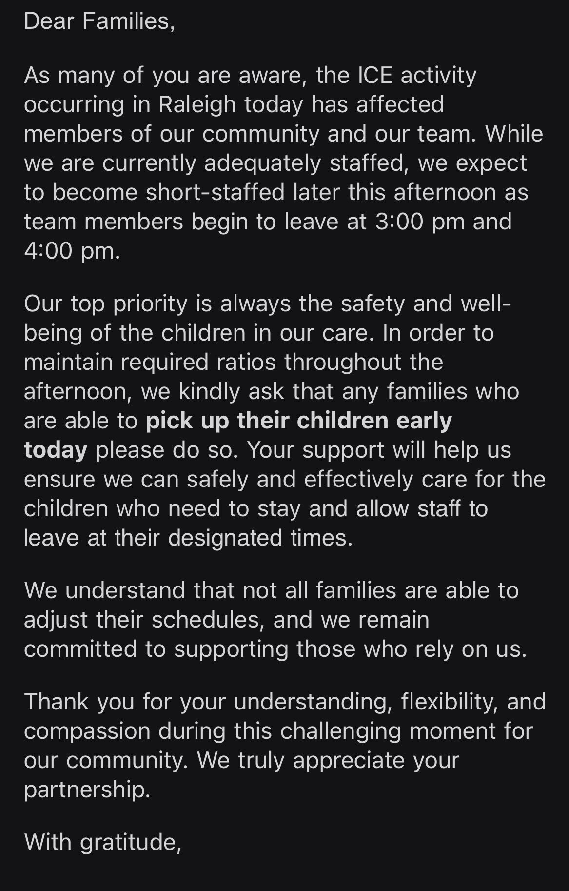 cool cool so glad that we’re have ice and border patrol protecting our country and totally not being fascist shitheels here in *checks notes* north carolina -