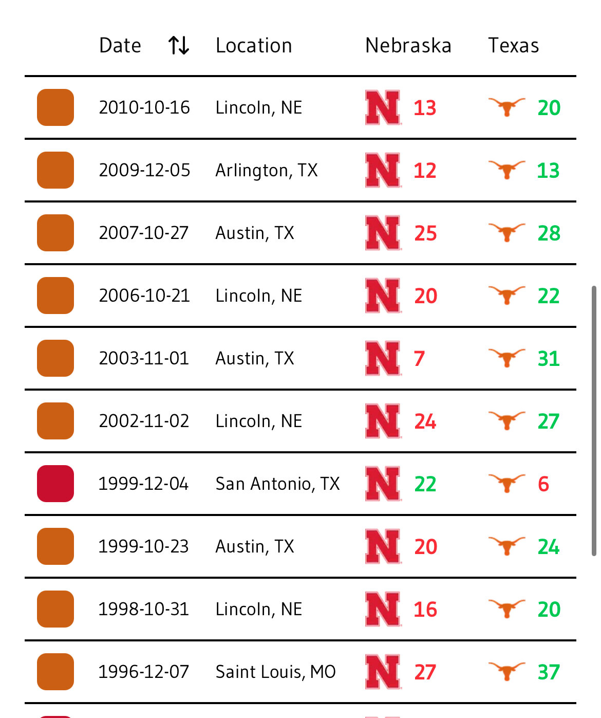 You could do a lot worse than an all day marathon of Texas/Nebraska (For the once loss, just fast forward to Bevo XIII in the Alamodome end zone) still mind blowing the 15 year run we had against them. every one of those has incredible moments seared in the memory: 12/7/96 Roll Left 10/31/98 Ricky/47 game home winning streak/standing O from Memorial Stadium 10/23/99 Mike Jones/McConaughey/bongo drums 12/4/99 Bevo XIII/cell phone flop out 11/2/02 Simms/Joel Myers/Dave Lapham 11/1/03 I actually don’t remember this one, beating Nebraska was becoming so second nature 10/21/06 Ryan Bailey/snow 10/27/07 Jamaal Charles 4th quarter 12/5/2009 1 second/Hunter Lawrence 10/16/10 Gilbert/ still the last time Nebraska was ranked top 5 -