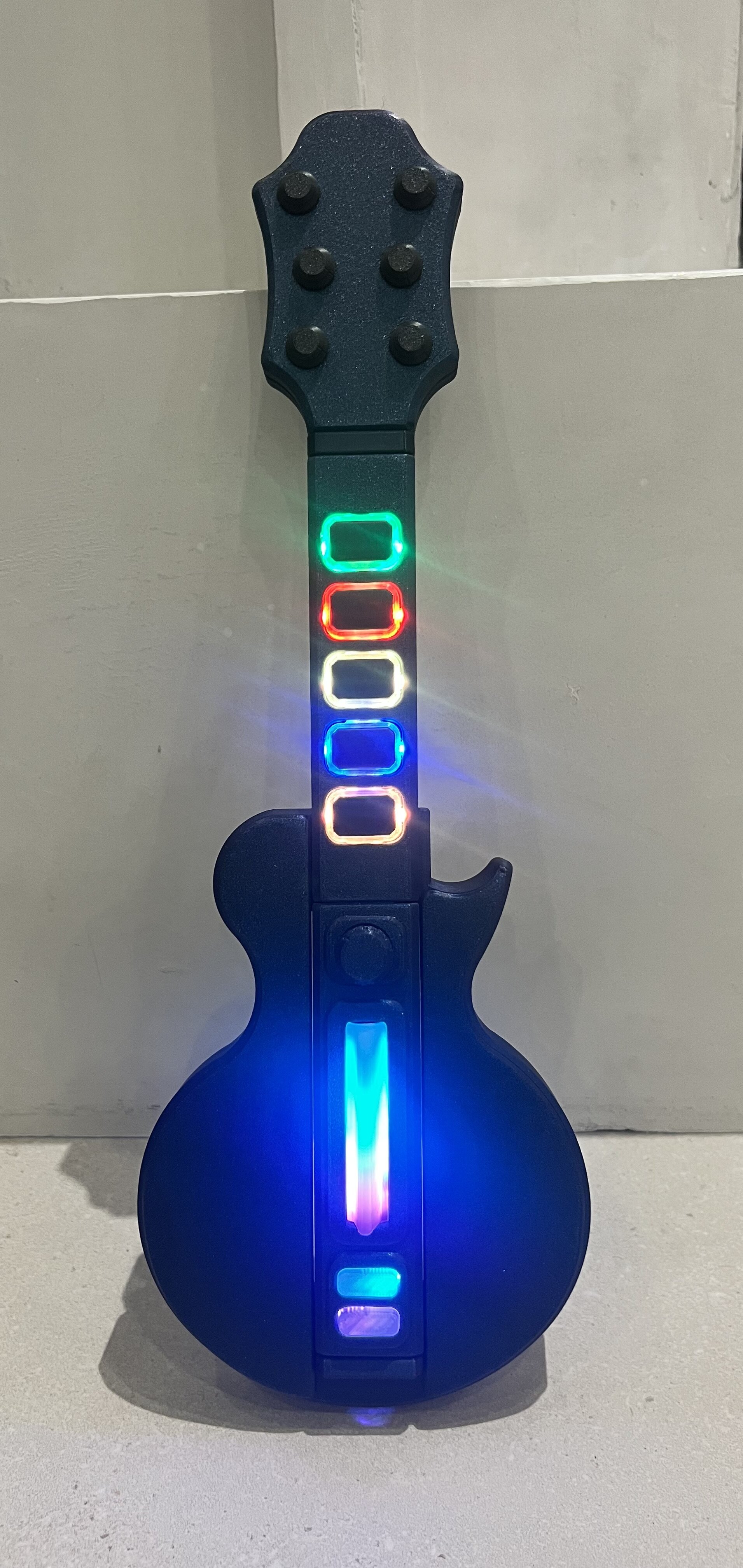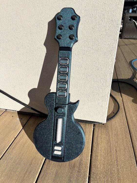 Last year around this time I put together an arcade cabinet with way too may classic games on it for the game room because nothing says “your parents are awesome” for the teens quite like crushing them on Galaga, right? One of my favorite games is Guitar Hero, but it doesn’t hit quite the same without the guitar. Of course I could buy a guitar, but why on earth would I do that when I can print one? I’d been stalking, reading about, and looking at build pics of the Polybar for a while and finally decided to do the build and I’m pretty thrilled with it. I picked up a sparkly dark blue filament for the main parts of the build and a transparent filament for the buttons.