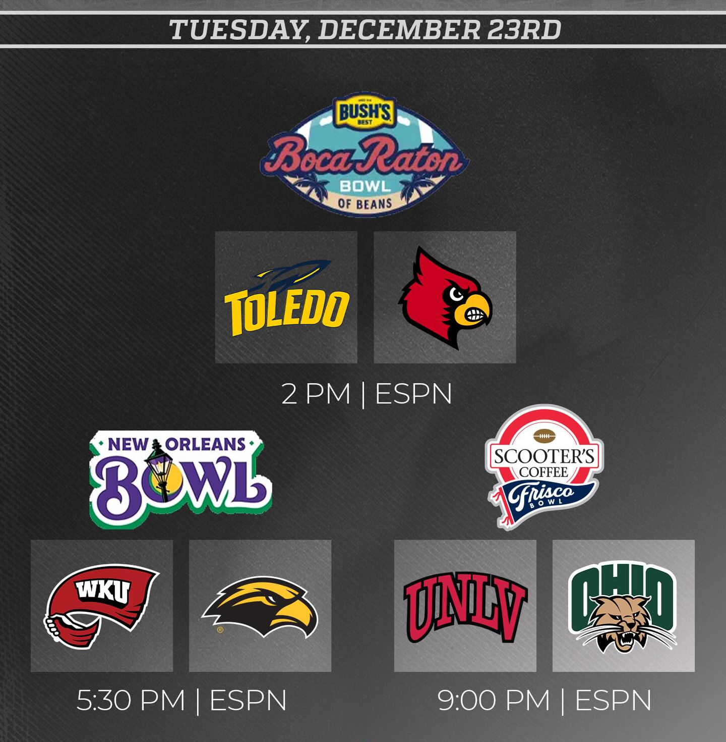 2025 Boca Raton Bowl - Louisville vs. Toledo Kickoff is at 1:00 p.m. CT on ESPN. Line is LOU -11.5 2025 New Orleans Bowl - Western Kentucky vs. Southern Mississippi Kickoff is at 4:30 p.m. CT on ESPN. Line is USM -1.5 2025 Frisco Bowl - Ohio vs. Nevada-Las Vegas Kickoff is at 8:00 p.m. CT on ESPN. Line is UNLV -6.5