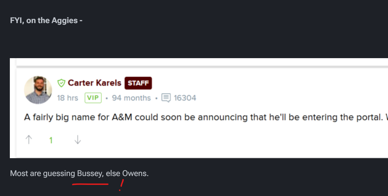 He was their big recruit. Until Concepcion showed up, he was their big hope. Undoubted game-changer. It would be a big deal if he goes to some other program and tears it up. Either the Aggies never found a way to use him or he's not as good as he was rated. It was small town high school competition, but he has flashed at A&M; he just hasn't made much of a mark. The Aggies constant expectation that he, almost alone, could lead them to greatness is why I recall him more than other players. Sometimes, I think being rated an athlete maybe confuses coaches when they get on campus. They dither too much about where to play him. I'm interested in how this turns out. @immamac BTW, love the upgrade. Looks and works great! Now my images won't be so huge. Well done!- Post a pic that makes you say "Holy shit."