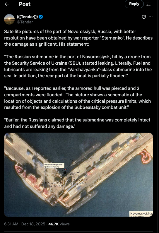My initial reaction was the subsea drone hit mostly the dock and less of the submarine. Maybe not. Per wiki, the Kilo Class submarine is 238-242 feet long, depending on the model. I merged a couple of screenshots of the submarines in the harbor, the targeted sub and a random sub at the dock. Bottom line, even though the videos show the explosion at the corner of the dock, it appears the attack may have inflicted more damage to the sub than what you can tell from the recent photos. The red line is ` 240 feet long