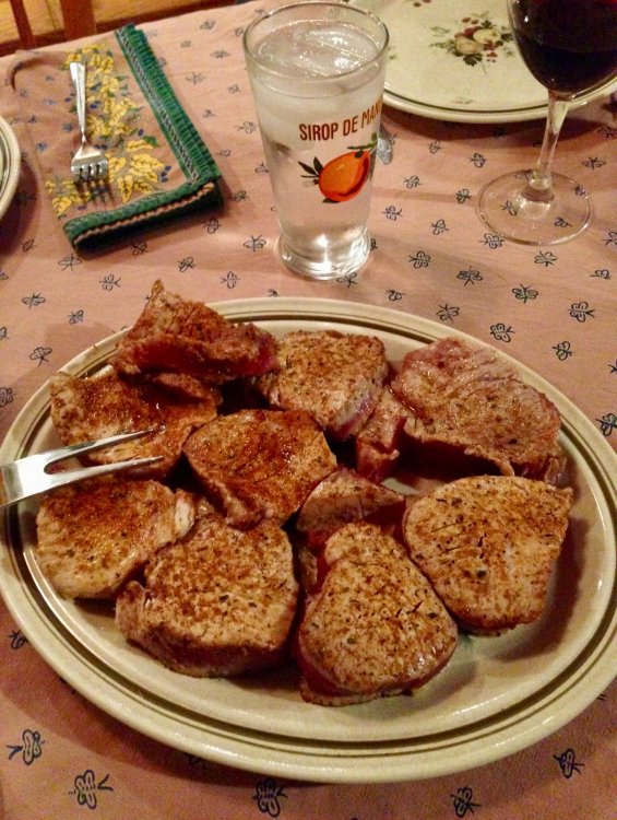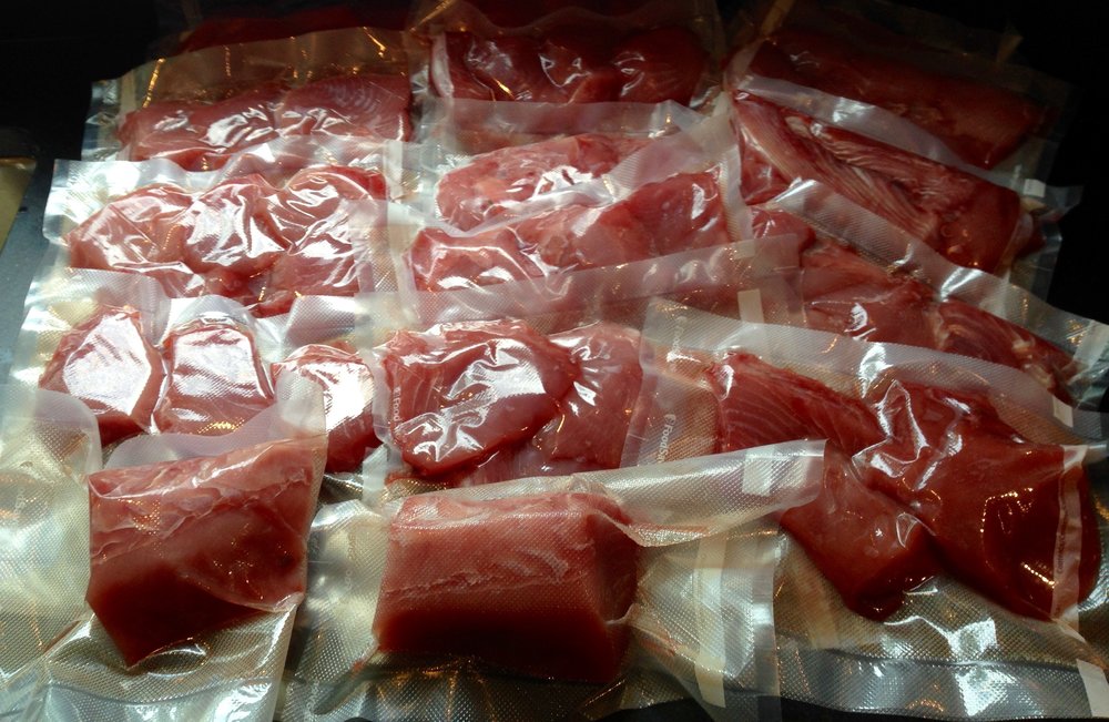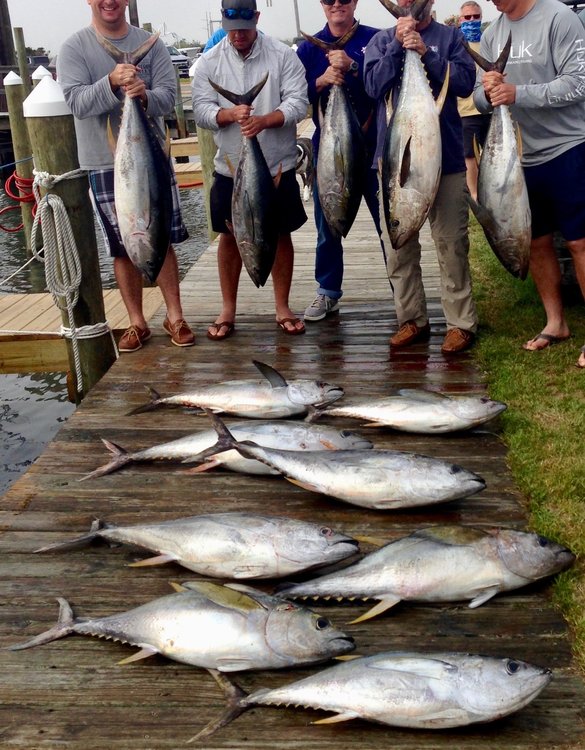 Spent Tuesday tuna Fishing out of Oregon Inlet, NC. 14 fish, 30-50 lbs. each, lost 2 to sharks, which gets really bad in the Summer according to the mate. Foggy as shit (50-100 yds visibility) on the ride out, and never really got that warm, We were 40 miles out (2 hour run at about 22-24 knots) still inside the Gulf Stream. Up at 3:30- back at the dock at 4:30. Going out of the harbor is a really choppy run in to 6-8' swells as water running into Back Bay meets water running out. One of our guys had that worried, greenish caste about HIS face till we got out in open water, and it laid down a bit, 1-4' very spread out seas, and a nice slow breeze all day. Vacuum sealed steaks, bites, and a few half loins. I got tuna for the year now. That first batch below was fucking great Paul Prudhomme Seafood Magic on butter coated slabs 10-15 seconds per side, paired with a wasabi, soy, teriyaki, worcestershire sauce for dipping. This week is bites, steaks, and tacos, and probably some tuna salad.9 points