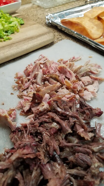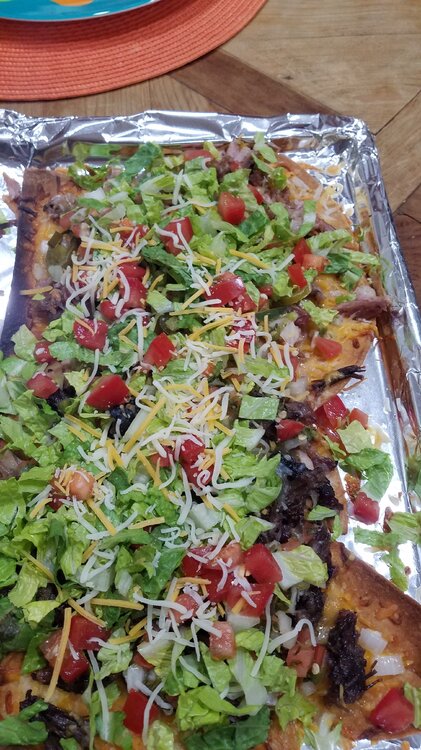 i feel like i might finally have something appropriate for this thread 😁... leftover Black's - beef rib, pork rib, chicken - nachos with homemade tostada chips and all the fixins...vegs, pico, jalapenos, etc. only thing missing was avocado, but didn't miss 'em. no beans bc husband does not like. also not missed. burnt the chip edges slightly, 10 seconds too long under the broiler... did not pose an obstacle lol7 points