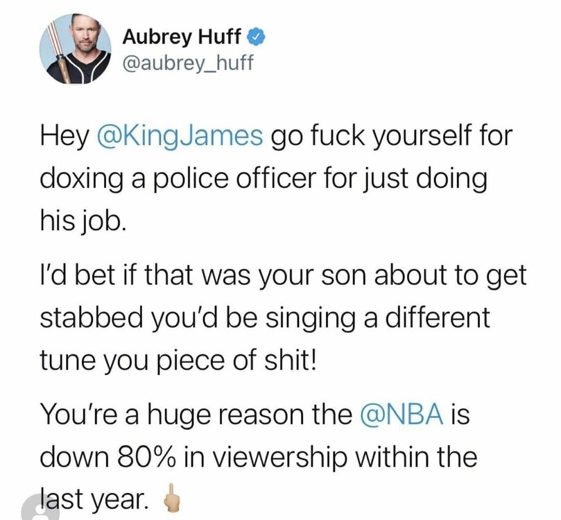 Man- that's not even what the China thing was about at all. I think you know this but maybe you don't. Lebron is all about "an injustice anywhere is an injustice everywhere" Morey tweets- we are standing at you during this time of injustice Hong Kong Lebron- tweets- well actually- and then takes a shit all over Morey b/c he makes so much money in China with credible sources basically saying he tried to get Morey's job. If you can't see how incredibly hypocritical and cynical that is- and how far apart from what you are saying then you have a room temp IQ, you aren't knowledgeable about how that all played out (my guess), or you are intentionally trolling/being incredibly intellectually dishonest. Nobody (at least not rational and idiotic) is saying Lebron has to give a shit about every injustice in the world- it's perfectly fine that he has his platform and wants to speak out on his issues. But he for fuck sure doesn't get to use his platform to fight injustices he cares about while cancelling Morey (who damn sure has earned the right to have a platform himself- albeit in a different way than Lebron did) for talking about injustices he cares about and has a personal connection to.6 points
