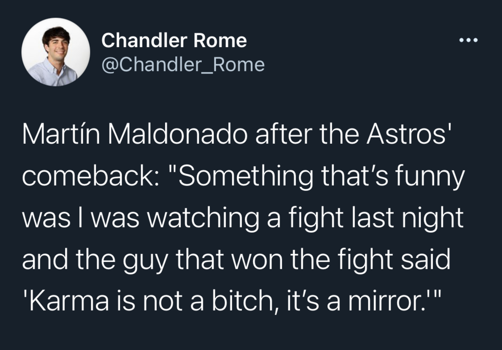 there's so much to unpack from today, so i'll just start listing them. tuesday was devastating for oakland, today was twice as devastating for the yankees. they had just started to play better. they're in real jeopardy of not making the playoffs. yankee twitter can't decide if the lede is "oh lookie loo, guess altuve can have his jersey ripped off now" or "fucking christ why can't we close a god damned game?" first off, the only reason they ripped his shirt off today is to tell yankee fans (and the media) to shut the fuck up about it. lol at people looking at a small tattoo that looks like it's in mid-removal and say "i thought he had a tattoo but where is it?!?" as for the closer situation, they're proper fucked. they have one good starter and ~1-2 good bullpen pieces. chapman is junk. green is junk. britton is junk and injured. superteam my ass. they are a long way from being a ~good baseball team. we walked them 14x today and won. i'd say we'll see them in oct, but maybe we'll just see them in 2022. judge was a whiny bitch in 2017 and he was a whiny bitch yesterday, and was probably so happy he got to perform his little touchdown dance celebration that he planned ahead of time. machete laughs at him, and altuve got the last laugh, again. momentum is a real thing, and it would've really sucked to lose 4 in a row, get swept by the yankees, and have the only discussion for the next 4 days be about the astros who weren't in denver. though i still haven't heard anyone say shit about mookie, who's in the midst of his hottest stretch of the year. or any of the other opt-outs. and while we're on the subject, fuck the media for making it into an astros story. trout has been out forever, acuna is now out for a year, glasnow is out, tatis keeps missing chunks of games (though is still a monster). bregman has been out for a month. injuries are crazy right now and i'm fine with all 25 guys sitting in a cryo-chamber until friday. we haven't hit worth a shit since tuesday, but somehow went 3-3 this week. felt much worse a few hours ago. explaining to my wife the unlikelihood of today unfolding exactly the way it did was a whole separate headache. baseball is not like other sports, where you know mj or kobe or elway or brady is going to have the ball and a chance at the end. this could not have been professionally scripted any better from the chapman bomb, through the scandal, all the buzzer bullshit, through the past 2 games, the judge jersey pull, the nonsensical reporting by fox yesterday, to a 7-2 deficit, to altuve coming up with a chance to walk it off. story-fucking-book-shit. g5 of 2017 world series was probably the best postseason astros game ever, followed somewhere by g1 and the tuve blast from 2019. but i'm having trouble remembering a more satisfying regular season (pre-july 15th too) game. how can you not be romantic about baseball?16 points