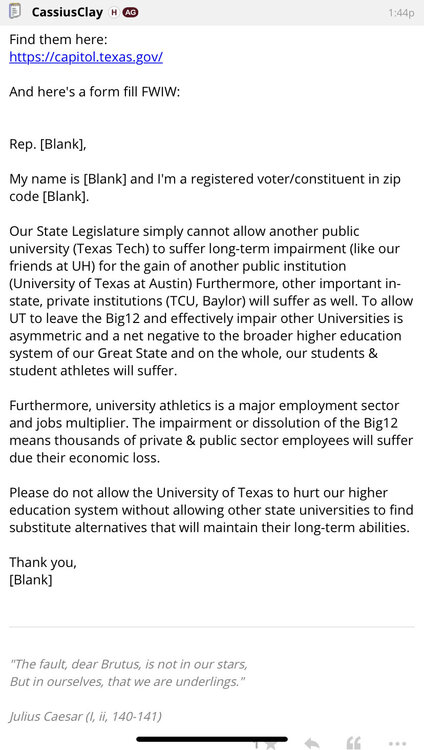 This is from Pat Forde. He’s always been favorable when he talks about Texas barring the Herman period. I’ve listened to him on radio shows before and he seems get the dynamics in state. This article is greatness, thanks. I’m not the only who has heard stuff over the past few days so others can chime in if they’ve heard otherwise, but yeah, there’s allegedly a permanent cross division and then randomness going through the other 7 over 14 year periods, which isn’t completely different than what they have now. ATM is allegedly begging to keep South Carolina as its matchup. LSU and Florida and LSU and Bama don’t feel like they need to play each other every year either, but one of those would seem likely to stick. There is a groundswell of sentiment around this and allegedly numerous programs/conferences are talking about it. So much shit is flying around right now that I won’t be surprised if the scheduling stuff is bullshit, but the word is that it isn’t going to take long for everyone to get answers. I believe the sequence of events that unfolds this week will answer almost every question. The one question that been answered the same way by everyone is that Texas and OU leave the conference after the 2021-2022 cycle. To that point, I have a good friend that played college ball with a current Big 12 HC. He and his family were visiting mine down in Galveston this weekend and he texted his college roommate and teammate yesterday and I saw the text string with my own eyes: ”Do you think Texas and OU are really joining the SEC? If so, how you feeling?” ”We have been told that it is a done deal. It’s terrible news and we’re trying to figure out what we do next. It doesn’t make sense for us to remain in the next version of this conference though. “13 points