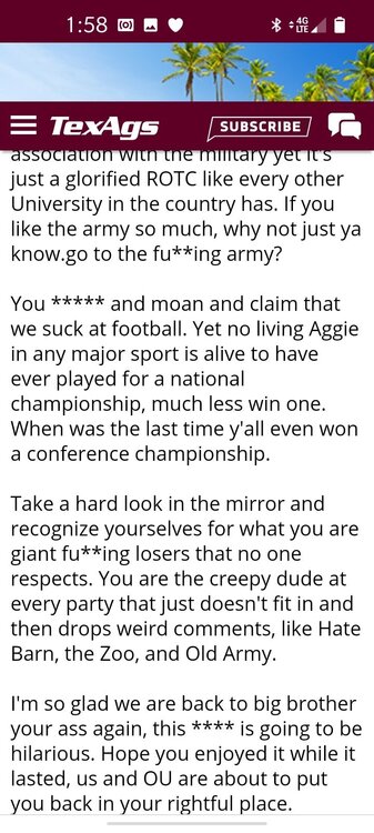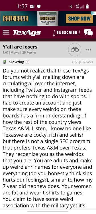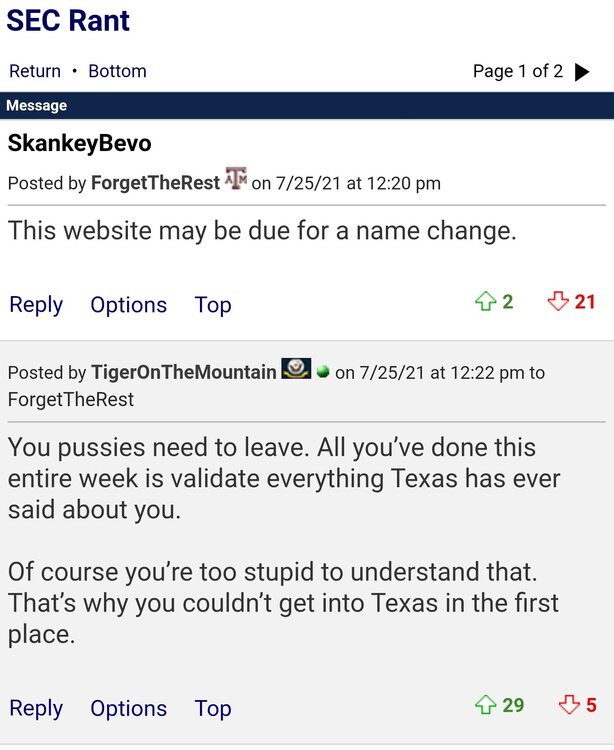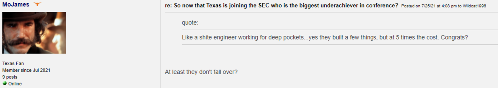 Maybe unpopular, but the majority of the Longhorns on SECRant talking shit are almost as cringeworthy as reading texags. They are not good at it and just comes across as lame. But I also never really understood signing up for a non Texas or even conference type message board. If you are gonna do it, at least do it as a troll.13 points