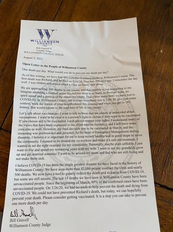 chronicle scathing..... Editorial: How can Abbott protect Texas from COVID when he can't protect himself? The Editorial Board Aug. 17, 2021Updated: Aug. 18, 2021 6:23 a.m. Texas Gov. Greg Abbott takes off his mask during a press conference on Thursday, Sept. 17, 2020. Texas Gov. Greg Abbott takes off his mask during a press conference on Thursday, Sept. 17, 2020. Ricardo Brazziell, Photojournalist / Ricardo B. Brazziell Personal responsibility, apparently, is for the little people. The powerful have Regeneron cocktails at the ready. The powerful have good health insurance and doctors who make house calls. The powerful can quarantine in the comforts of a taxpayer-funded mansion in downtown Austin. That’s one takeaway from the announcement Tuesday that Texas Gov. Greg Abbott has COVID-19 — the very day after he tweeted about his appearance at “another standing room only event in Collin County” attended by an estimated 600 people. The tweet included photos of the event in which the maskless governor waves from a stage, facing a tight crowd of applauding supporters — nary a mask in sight. How can we trust the governor to protect Texas from this raging pandemic when he won’t even protect himself — or, for that matter, his supporters? We wish the governor a speedy recovery, which is highly likely given that he is fully vaccinated and was reportedly experiencing no symptoms — yet another reminder how even though breakthrough infections occur, they rarely involve severe illness, prolonged hospital stays or death. The bigger concern is whether Abbott exposed any of his unvaccinated supporters in one of his many campaign events, where photos have shown him rubbing elbows without a mask in large indoor gatherings, at times in up-close-and-personal conversation, at times squeezing in for photos or sharing a laugh under a crowded tent. What happened to the governor’s March speech, where he announced that Texans had “mastered” the safety protocols such as masks and distancing that can stop the spread of COVID? What happened to the worn-out phrase he regurgitates every time he defends his callous ban on local mask requirements: “We’re past the time of government mandates, we’re into the time of personal responsibility.” If a man elected to lead nearly 30 million Texans can’t be trusted to act responsibly, how can he effectively persuade others? We’re not just talking about the upper-income folks who attend Republican gubernatorial fundraisers. We’re talking about the millions of children returning to school who can’t be vaccinated. We’re talking about the rural Texans who must travel an hour to a hospital, only to find there are no beds available. We’re talking about the multitudes of Texans who have no health insurance and no relationship with a trusted doctor who can inform them about vaccines. Texans are watching you, governor. What are you showing them? Not a champion of personal freedom. Only a mascot of incompetence. An elected chief executive who is now contagious and home-bound because he refused to follow his own advice to the little people. A governor who not only refuses to lead an effective campaign urging Texans to protect themselves and their communities, but actively threatens to punish and sue local leaders who try to impose safety requirements such as mask-wearing. Sure, many Republicans had a great deal of fun chiding the COVID cases among Democrats who flew on a chartered plane without masks to DC in early June. They should have worn masks. But their indiscretion came at a time when many Texans were happily tossing our masks after becoming fully vaccinated. We had done our part — or so we thought. We didn’t account for the new, more contagious delta variant and the millions of fellow Texans who did not get the jab, and still won’t wear so much as a mask to stop the spread. We didn’t account for a governor who condones their irresponsible conduct with his own. Abbott’s carefree maskless outings come as Texas is experiencing what health experts call the worst surge of the pandemic. Across Texas, more than 11,700 are hospitalized for COVID. Rural hospitals are turning away patients — COVID and non-COVID — and trying to fly critical ones out of state for care, watching some die in the process. In Harris County, the largest contiguous medical center in the world is spilling over with the highest number of COVID patients ever admitted. Local officials say several hundred can’t even get in the door. Houston has reached the grim milestone of more than 3,000 COVID deaths and officials announced Tuesday that one in every five Houstonians getting tested is positive. The state’s response has been too little too late. While the health department recently announced it was opening nine infusion centers for Texans to receive Regeneron’s experimental monoclonal antibody treatment that can help mild cases avoid hospitalization, NBC News reported on Monday that Texas had also requested five mortuary trailers from the federal government in anticipation of an influx of dead bodies. Abbott likes to say, in another context, “the most precious freedom is life itself.” We agree. More than 54,000 Texans have lost theirs now — some because they believed vaccine conspiracies and some because they believed political leaders who claim a face mask is more tyrannical than a deadly infectious disease. The governor is reportedly feeling fine, self-isolating and receiving the Regeneron treatment as a precaution. He seems to be in good hands. If only we could say the same for Texas.9 points