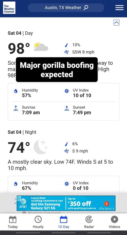 Surliest of assholes, today is the day we have been waiting for since December 30th of 2020. Lets start with the weather forecast today, then talk about what to expect from our first game of the year. As you can clearly see its going to be hot as fuck. Field temps around kickoff are expected to be over 100 degrees. What's this though, the major prediction is there is major gorilla boofing expected? What is gorilla boofing you may find yourself asking. Gorilla Boofing (ɡəˈrilə buu'fing) verb - getting violently butt fucked by a gorilla or in the style of a gorilla. Example: The Texas Longhorns are Gorilla Boofing the Louisiana Ragin' Cajuns today. Well shit, if the weather channel thinks there is major gorilla boofing expected, who am I to argue with them? Lets get into the pre-game breakdown. Billy Napier is a really nice guy who is taking his time making sure the ragin Cajuns are a perrenial winner of the most powerful conference in football. The sunbelt conference. They are stacked with 2.5 star talent, have excellent discipline, and their names will mean literally nothing to you when you hear them. Returning a bunch of starters or something. Then we have the Texas Longhorns football team. There's a new coach in town, Steve Sarkisian. He's come into town and immediately let us know that his brain engine has a serious defect. It is only capable of All Gas with No Brakes. The Longhorns are playing their last season in the absolute joke of a conference the Big XII and return a roster that makes my special parts move. Filled with Household names like Bijan Robinson, Cade Brewer (A Burnt End) and Demarvion Overshown. Expect to see an aggressive and relentless attack led by the defense, followed up by the offense making quick strikes on explosive plays. Crack open a cold beer, pour yourself a nice wine spritzer or enjoy your beverage of choice starting now, because we are in for a glorious day of Texas Longhorns football. Hook 'Em P.S. For less than 2 cups of Starbucks coffee a month you can support the Burnt Ends. Find more information here. https://www.surlyhorns.com/board/index.php?/burnt-ends-nil-program/26 points
