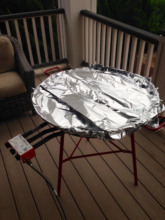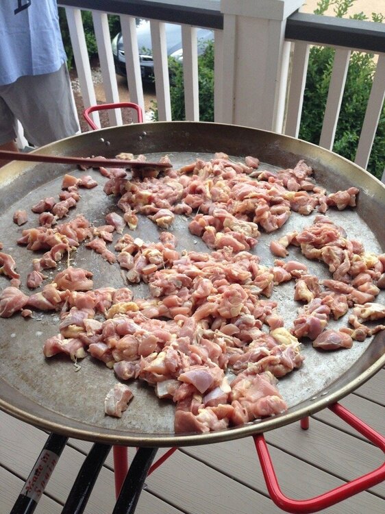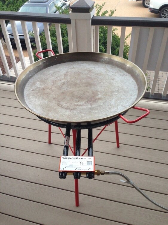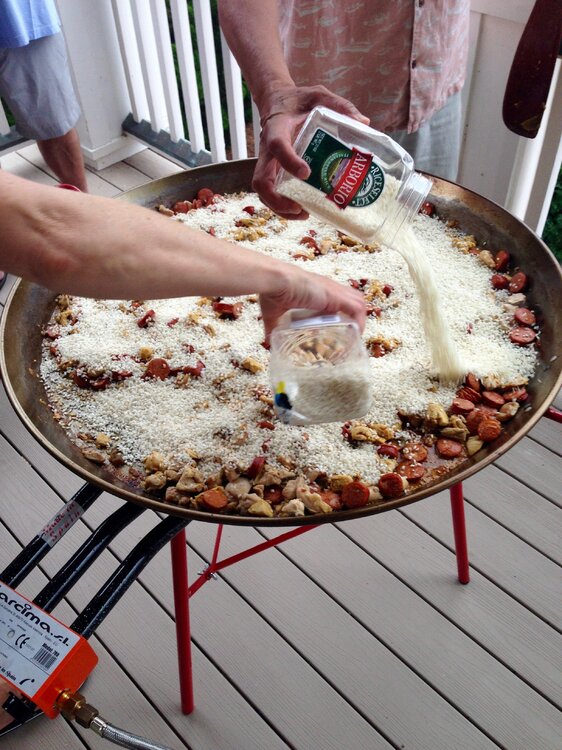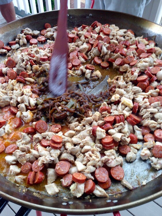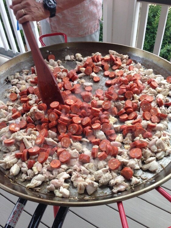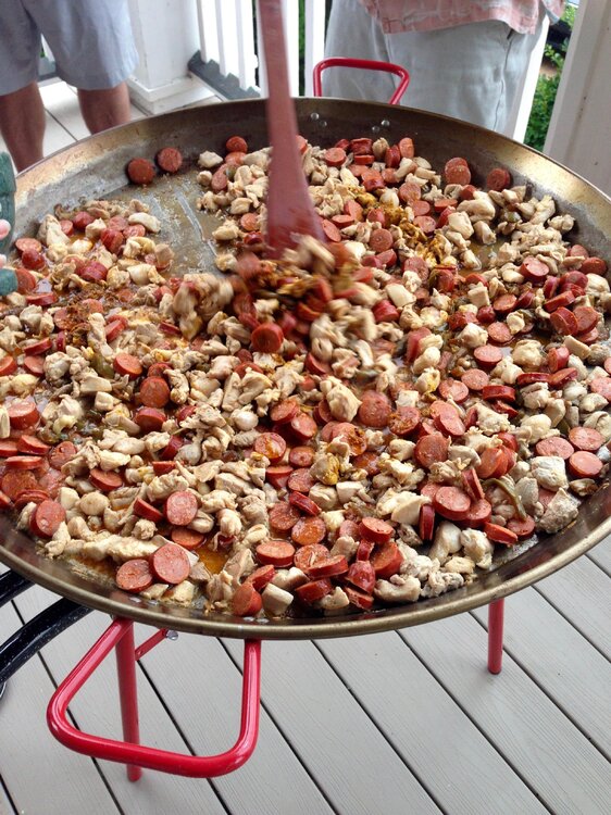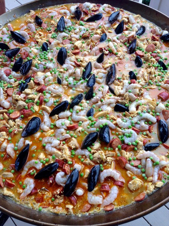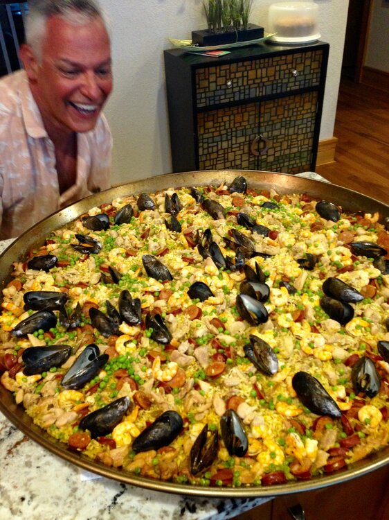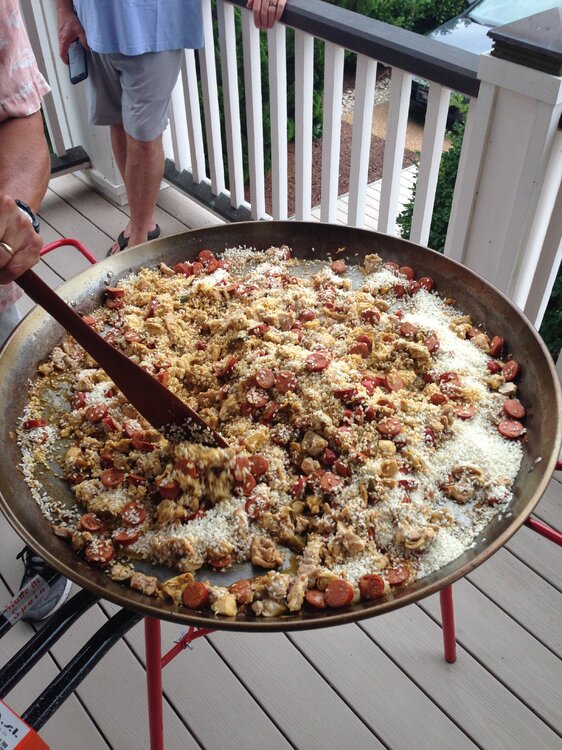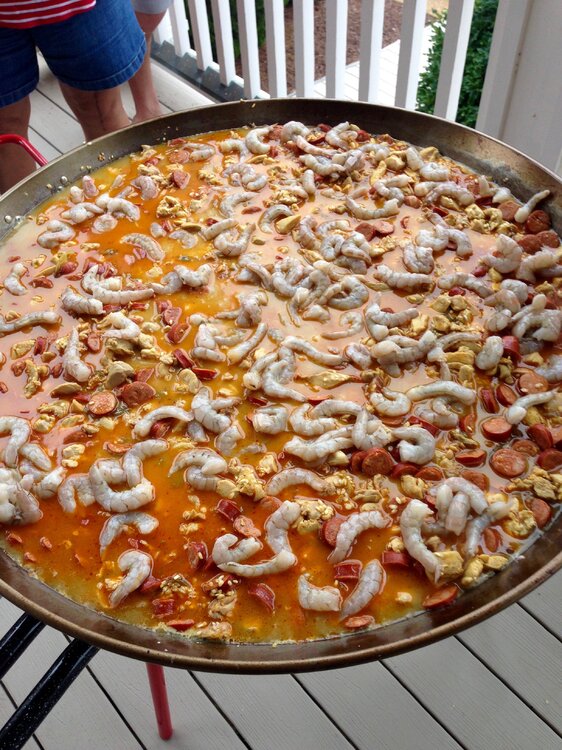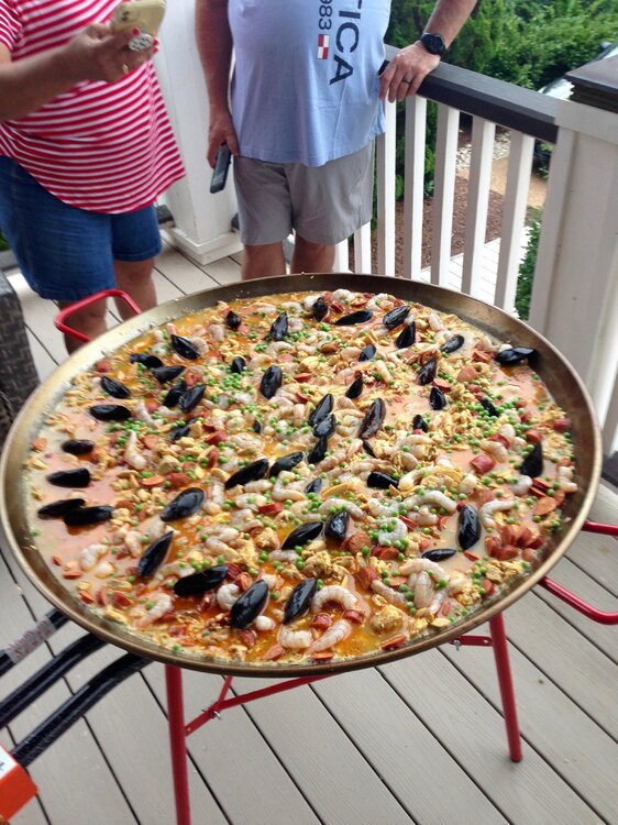 Spent some time at the beach with our long time port-o- geezie speaking buds for a day or so last week. That's a 32" dia. paella pan. They had to make sure it'd fit in the front door after cooking. Start with chicken, sausage, peppers, spices, etc, more cooking. Then it's the rice, and broth. Shrimp, and mussels next. Then it becomes an industrial sized Jiffy Pop popcorn maker for 45 minutes. Feeds about 35 easily. These people know from Paella !!!!17 points