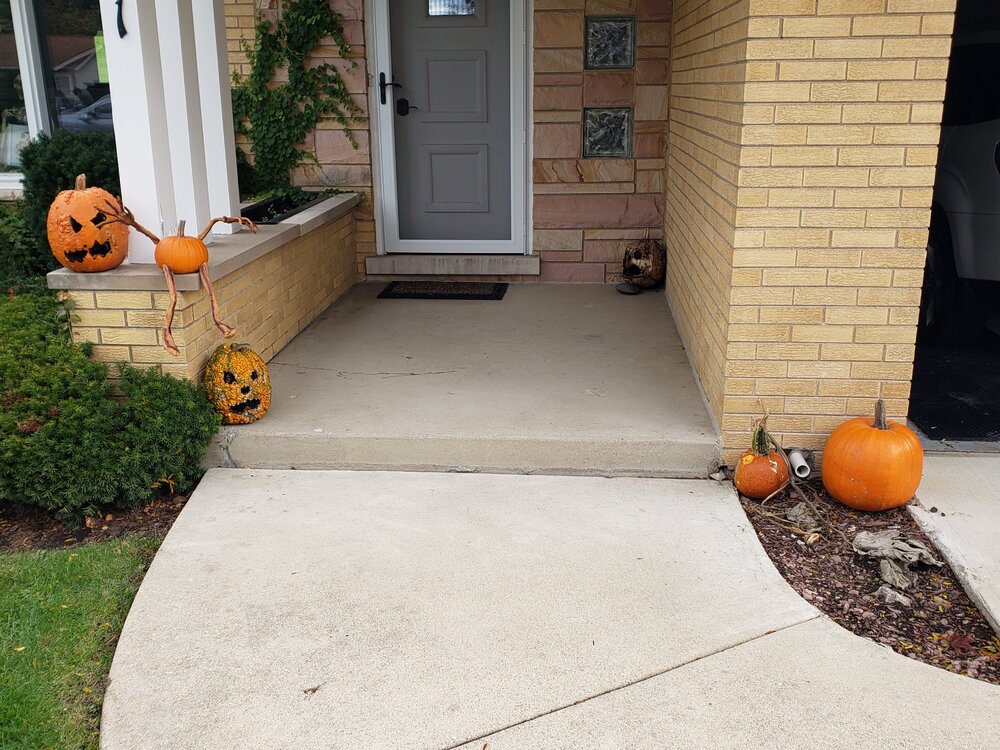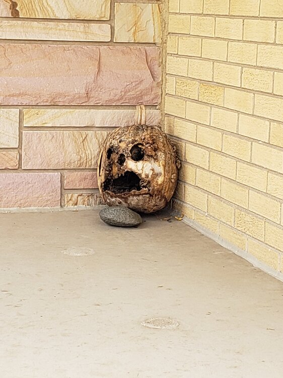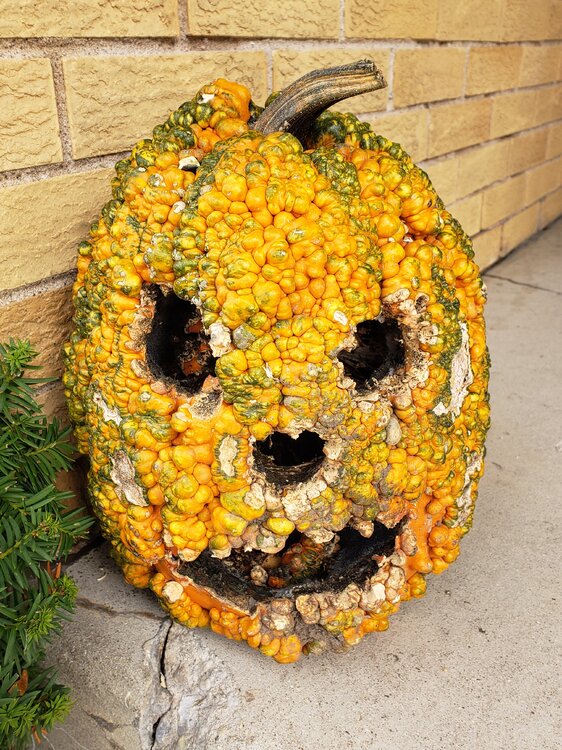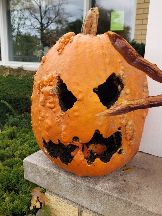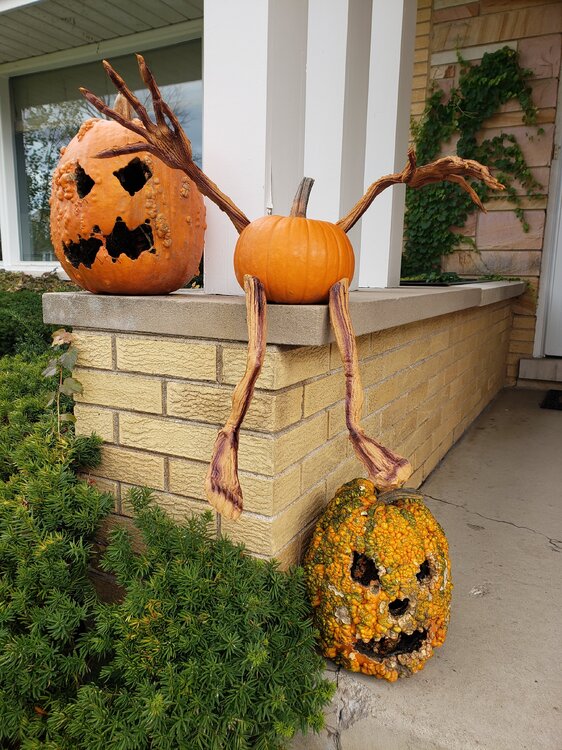 Doomlet was a complete butthole yesterday so we didn't carve our last two pumpkins after all, though I did install the arms and legs that I received for Father's Day. Here's everything as of earlier today. I moved Sr. up to a protected spot on the porch to guard against shithead teenagers. Jr. continues to feed local fauna. Green guy is probably going to have staying power, though he's becoming more orange over time. The orange new jack is just a boring old pumpkin and is already getting mushy in spots. Also including a picture of the tableau in our front window.6 points